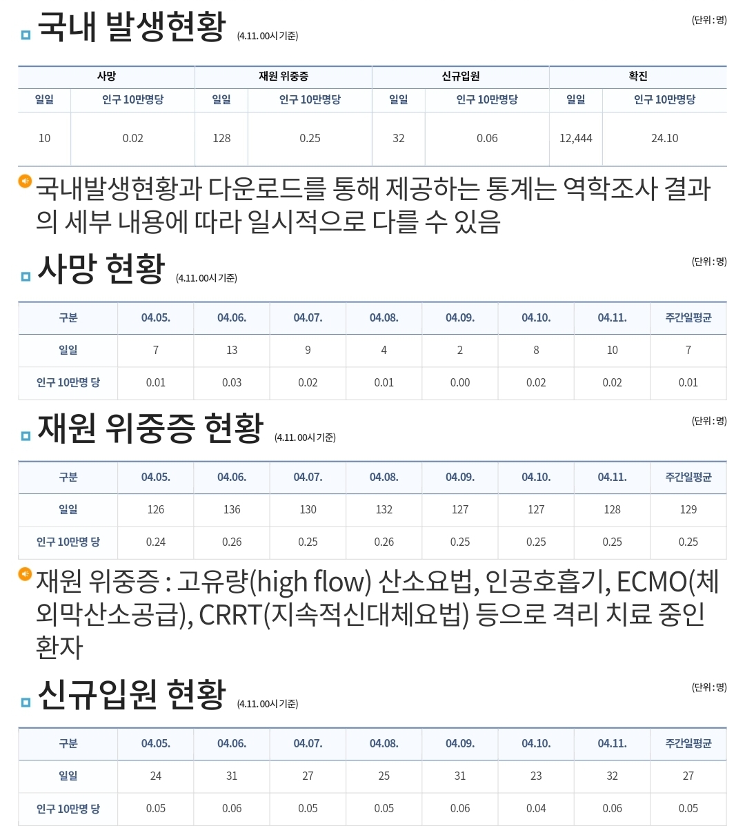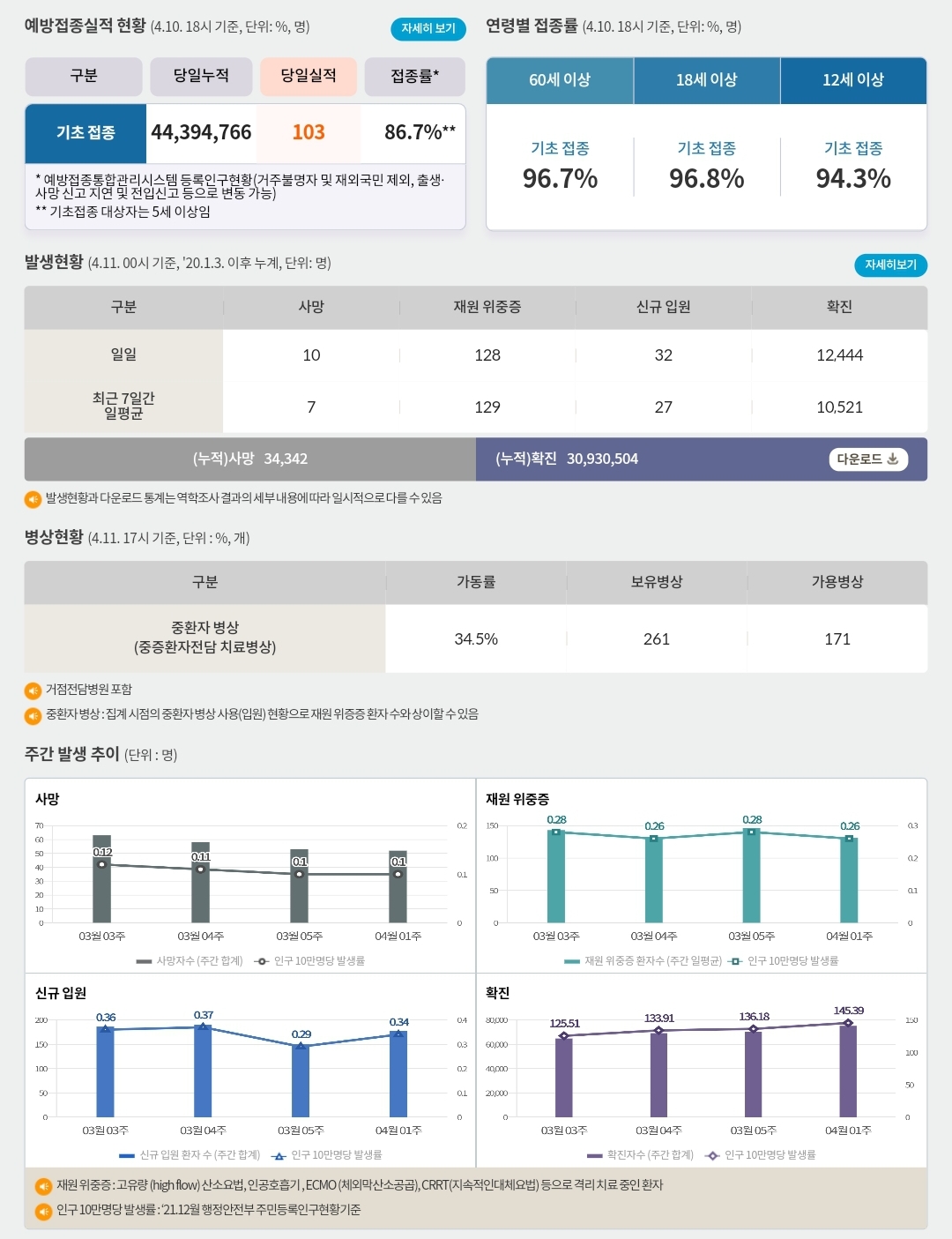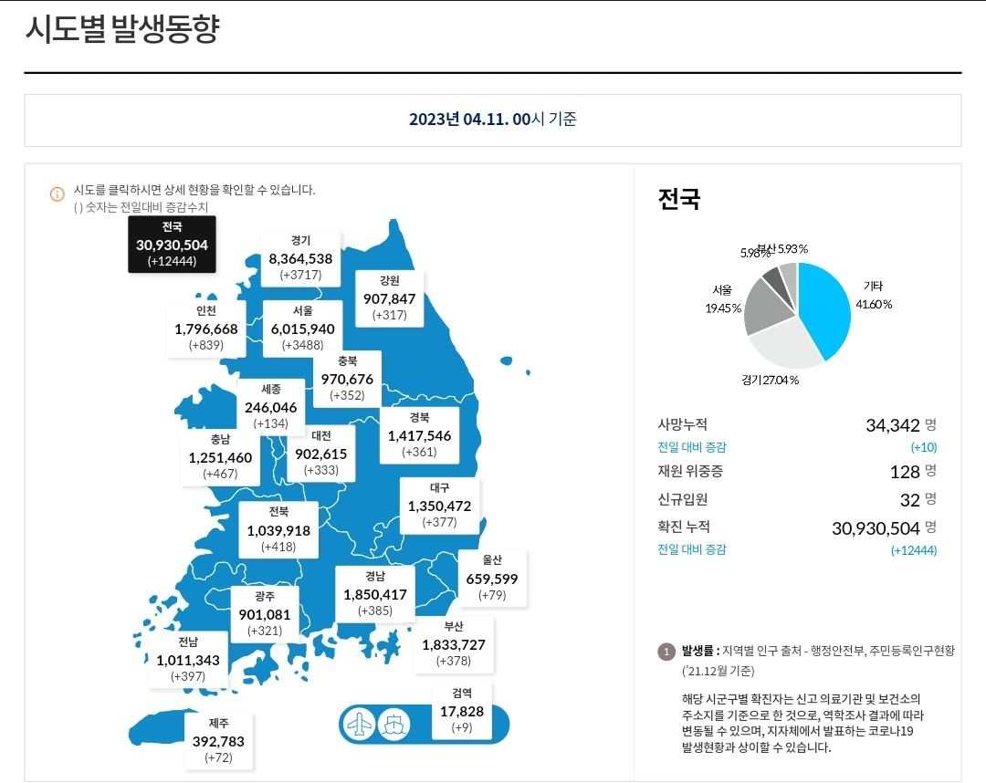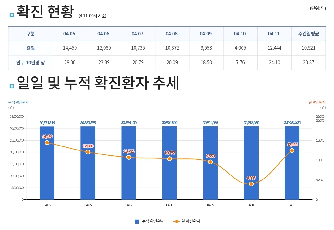 코로나19집계(2023.4.11. 0시기준) 확진 +1.2만, 사망 +10명, 중환자병상가동률 35% 본문