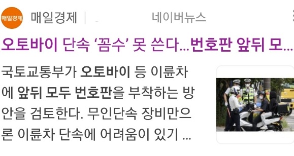 ㅡ 현장에선 이륜차의 법규 위반 단속이 어려워 (......) 무인단속 장비는 주로 차량의 전면 번호판을 찍는 방식이라 번호판이 후면에 있는 경우 단속을 피해 갈 수 있기 때문.