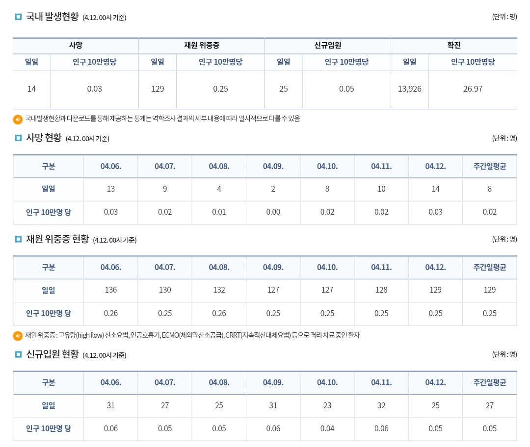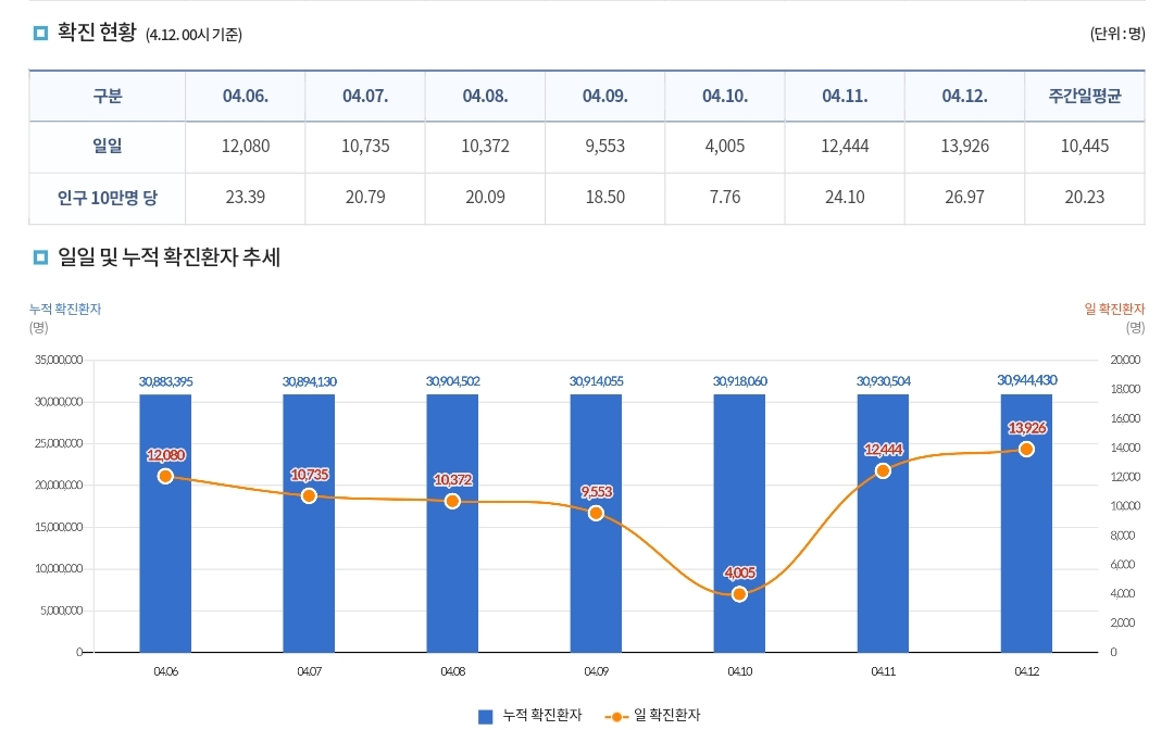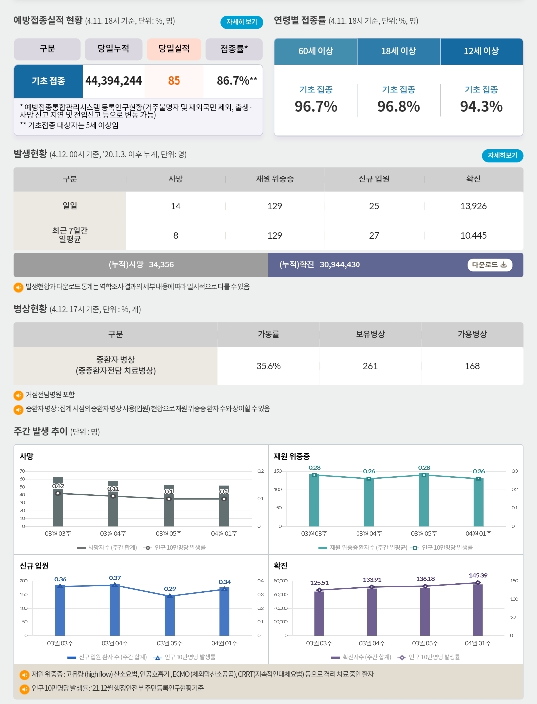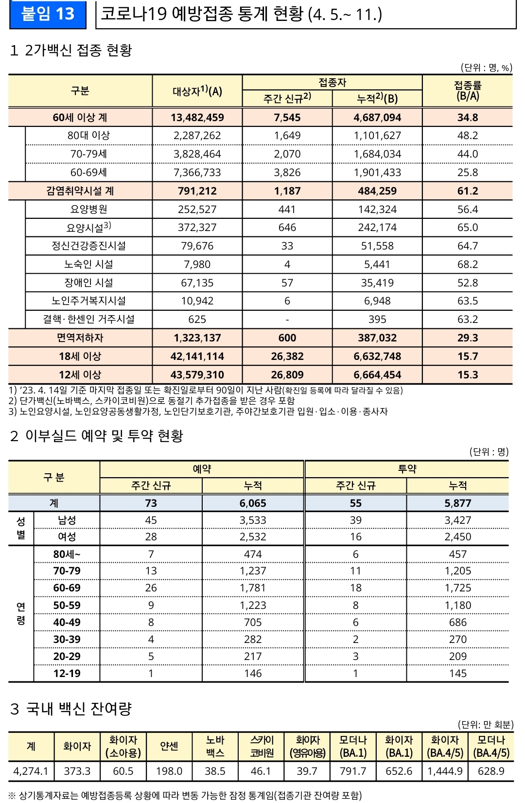 코로나19집계(2023.4.12. 0시기준) 확진 +1.4만, 사망 +14명, 중환자병상가동률 36%/:/ 발생 및 백신 주간통계 본문