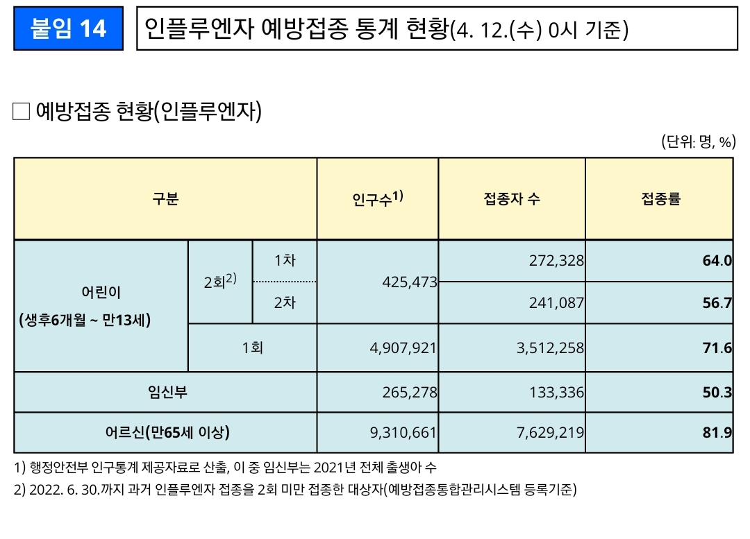 인플루엔자 예방접종 통계 현황(4. 12.(수) 0시 기준)