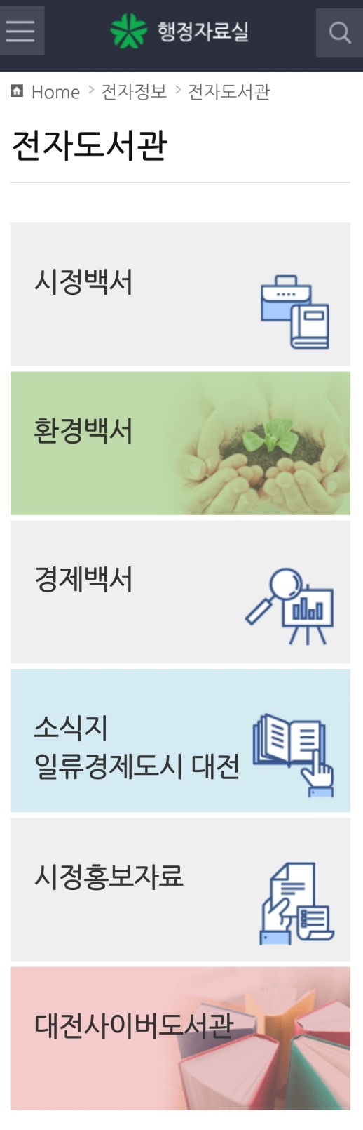 시정 소식지와 홍보자료, 백서(시정백서, 환경백서 등), 그리고 외부사이트 링크로 대전사이버도서관입니다.