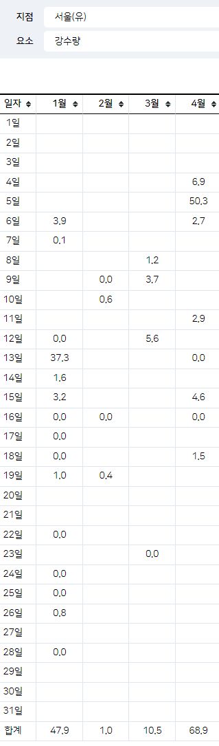 4월 강수량은 약 70밀리정도. 올해 1월부터 다 합해서 석 달 반 동안 127밀리 남짓밖에 안 되는 가문 날씨입니다.