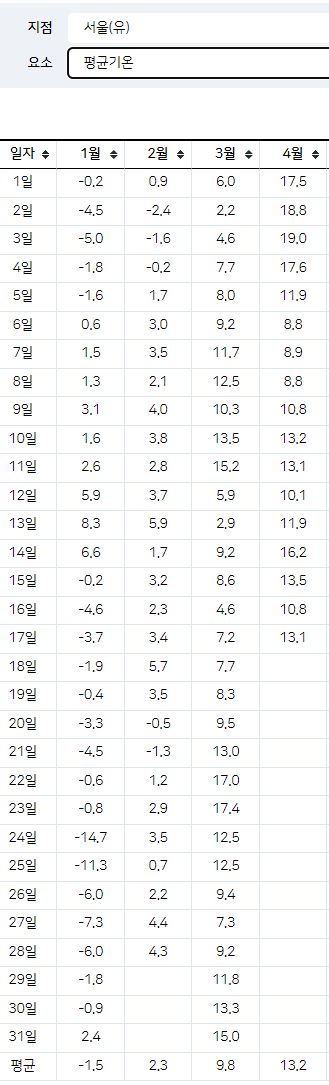 2023.1~4월 서울지역 평균기온과 강수량입니다.