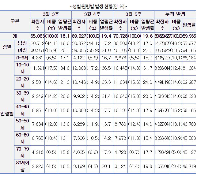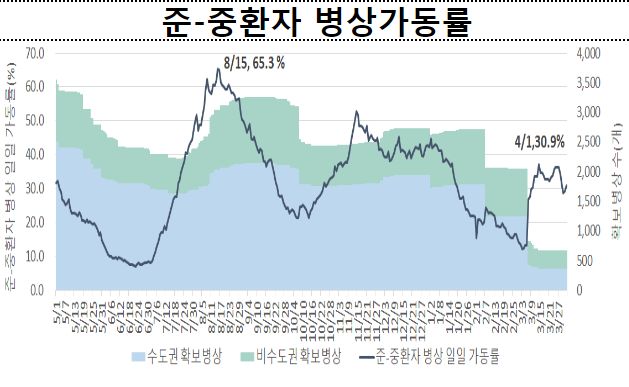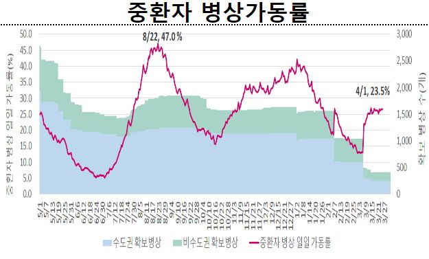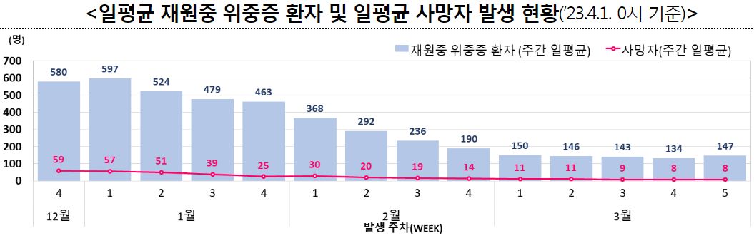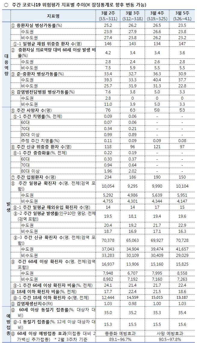 3월 5주 일평균 재원중 위중증 환자 중 60세 이상은 130명(88.4%), 일평균 사망자 중 60세 이상은 7명(87.5%)이었다.