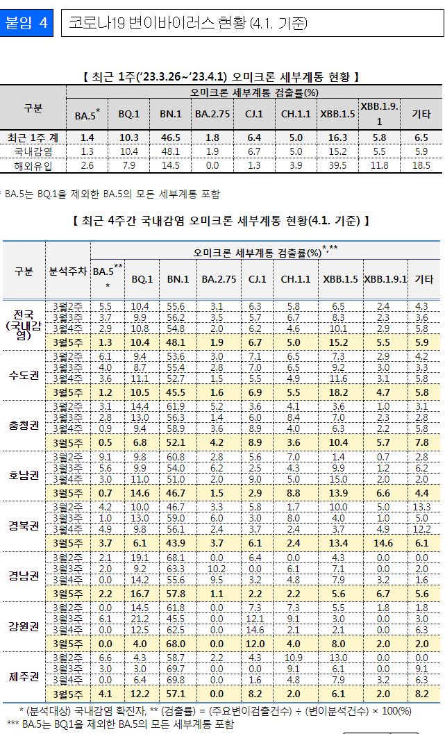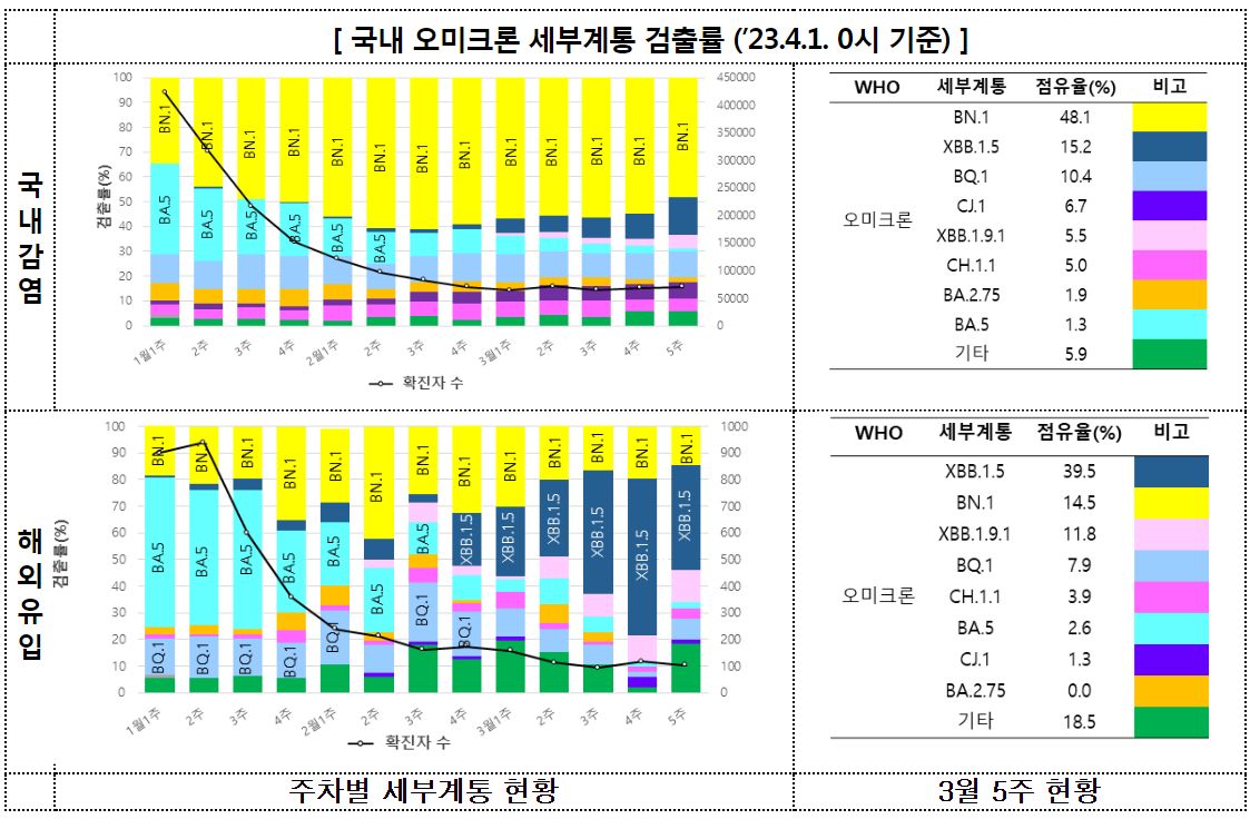 현재 XBB.1.5를 포함한 XBB계통의 면역회피능으로 인한 검출률 증가가 예상되고 있으나, XBB는 BA.4/5 기반 2가 백신에 유효한 것으로 나타나고 있고, 또한 질병관리청의 자체 분석결과* XBB 뿐만 아니라 이미 국내에서 우세화 된 BN.1 모두 이전에 우세화 되었던 BA.5대비 전파력이 높지 않은 것으로 평가되어, 종합적으로 크게 우려할 상황은 아닌 것으로 판단되었다.
