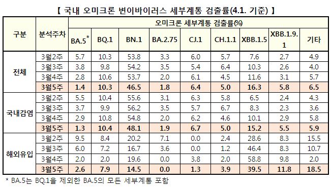 1월 4주 우세종화된 이후 50%대를 유지하던 BN.1의 검출률은 46.5%(-7.2%p)로 전주 대비 감소하였고, 재조합 XBB.1.5는 16.3% (+4.7%p)로 확인되었으며, BQ.1은 10.3%(-0.3%p), CJ.1은 6.4%(+0.3%p)로 확인되었다.