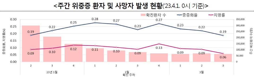 3월 3주차 확진자를 2주간 모니터링한 결과, 중증화율 0.19%, 치명률은 0.06%이었다.