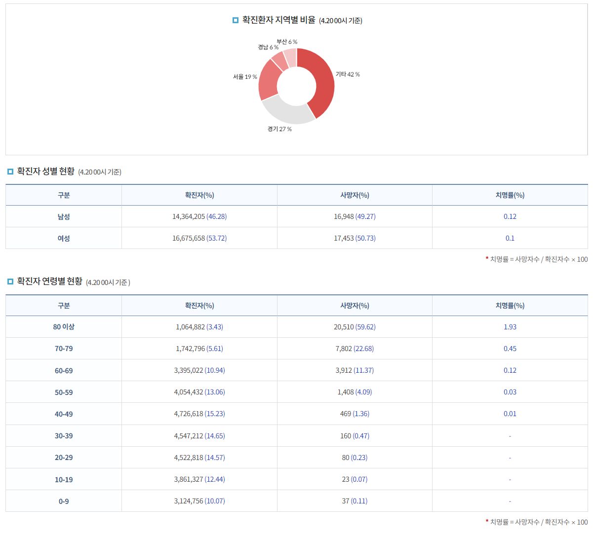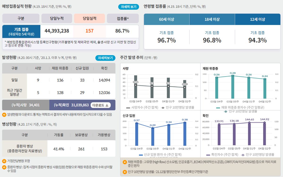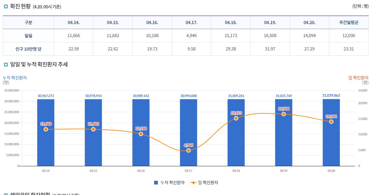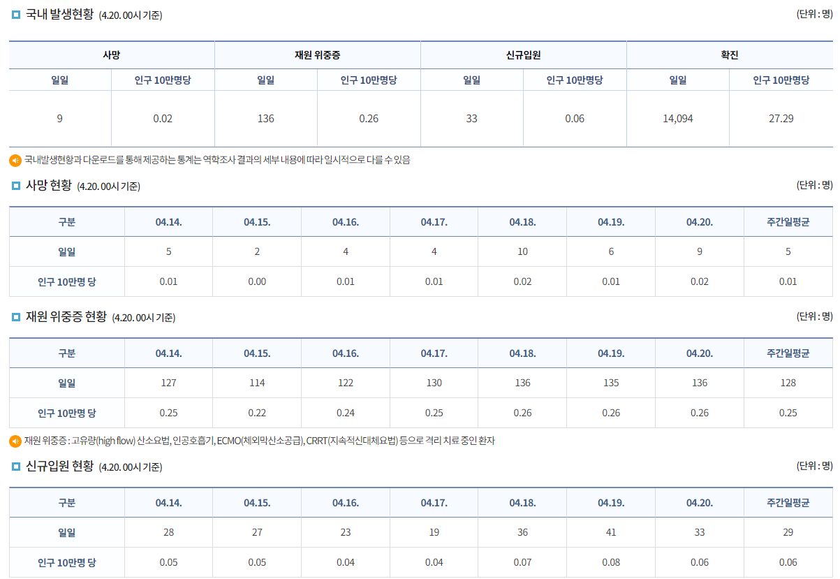 코로나19집계(2023.4.20. 0시기준) 확진 +1.4만, 사망 +9명, 중환자병상가동률 41% 본문