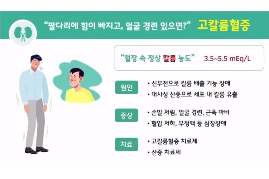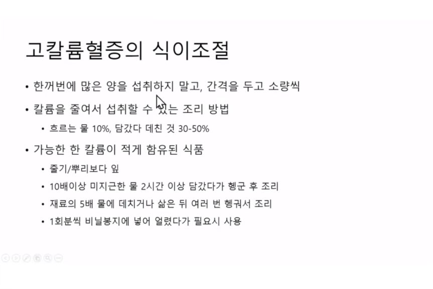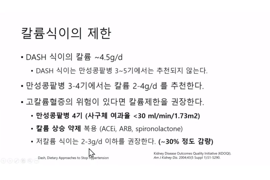 혈압: 원래 정상인에서는 나트륨은 혈압을 올리고 칼륨은 낮추는 영향을 준다고 알려져있지만, 만성콩팥병 4~5단계에서는 몸에 칼륨이 많이 쌓이면(콩팥이 남는 칼륨을 못 빼면) 부정맥 등 심장에 안 좋은 영향을 준다. 그래서 칼륨섭취를 줄이는 것.