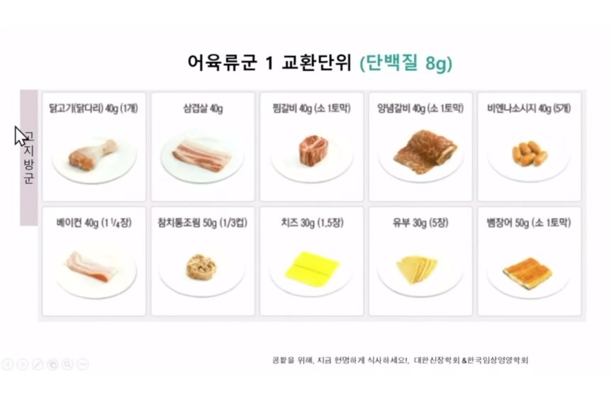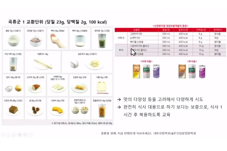 ㅡ 투석받는 경우는 5단계쯤인데, 투석을 받으면 콩팥기능이 4단계 정도라 생각하고 밥을 먹되, 단백질이 투석으로 더 빠지니까 고기반찬은 약간 더 먹고, 특히 소변이 잘 안 나오는 투석환자는 수분섭취도 제한해야한다.
