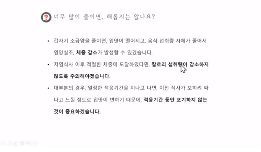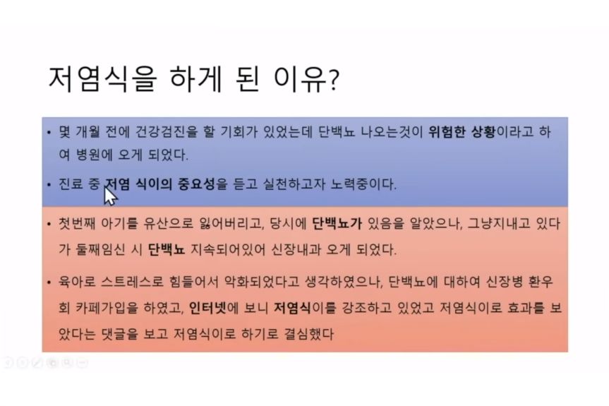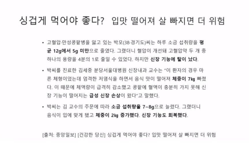 단, 소금만 줄이는 게 아니라 싱겁게 먹으니 식욕이 없다며 밥 자체를 너무 안 먹어서 체중이 갑자기 정상미만으로 빠지면(영양실조) 콩팥도 비상이 걸림. 더 안 좋은 환자도 가끔 있다. 병치료에는 체력이 필요해...