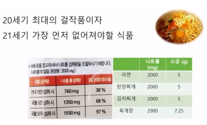 국제보건기구 1일 소금(NaCl) 섭취 권장량은 5g 이하. 대략 라면 한 봉지 남짓에 든 소금량이 1일 권창치. 하루 라면 3봉지 먹으면 하루 권장치의 3배를 먹는 것. 저 2005년것.
