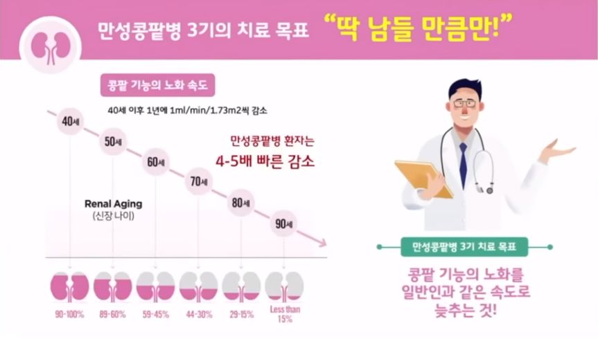 사람은 나이들면서 사구체여과율이 떨어지는데, 콩팥병환자들은 더 빠르게 나빠진다.
