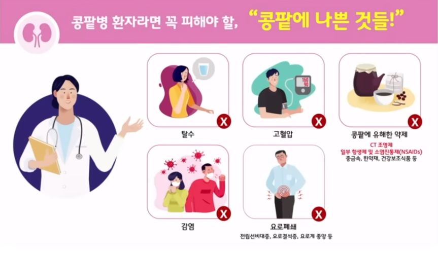 병원에서 검사용이나 치료용으로 처방받거나 주사받는 약제(CT조영제, 일부 항생제, 소염진통제)가 그대로는 콩팥에 나쁠 수 있다.