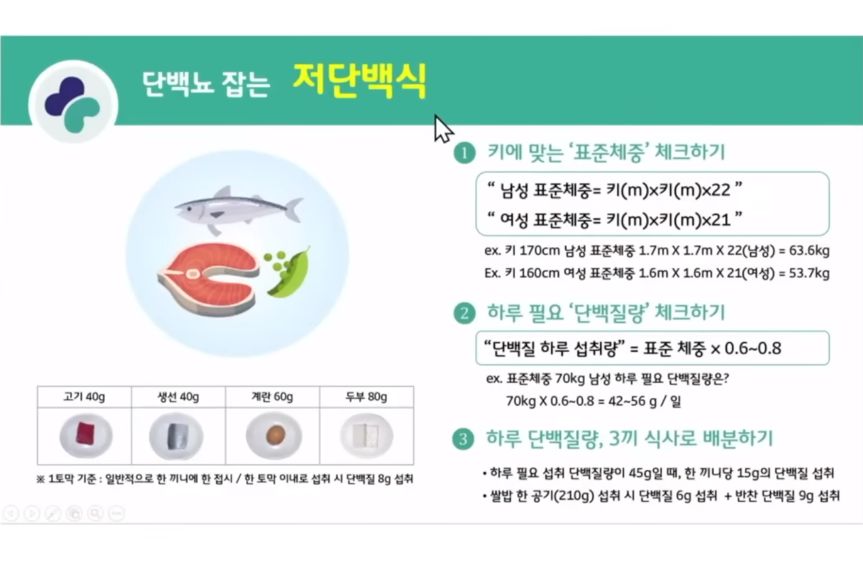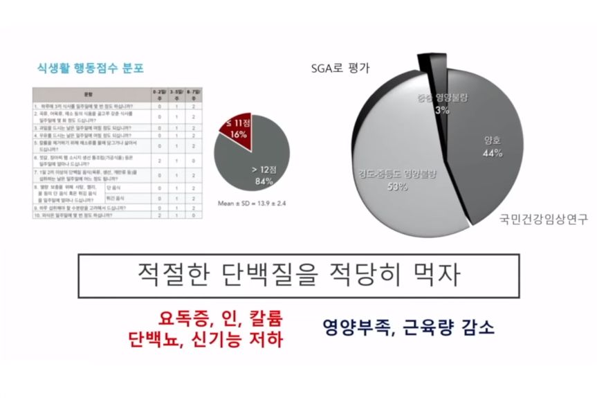 단백질 적게 먹으라니까 못지키는 사람도 있지만, 애써 지키다가 영양실조하게 안 먹는 사람도 있는데, 그렇게 되지 않도록 주의.