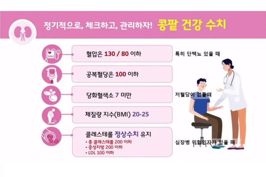 2. 콩팥병이 진단됐으면 더 나빠지지 않도록 관리하는 것. 말기 신부전증으로 가거나 합병증이 생기지 않게 또는 되도록 늦게.