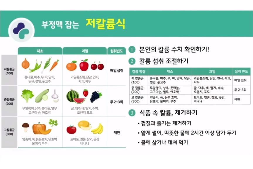 저칼륨식: 만성콩팥병 4~5단계가 되면 나트륨제한만이 아니라 칼륨제한식도 의사처방에 따라 해야 한다.