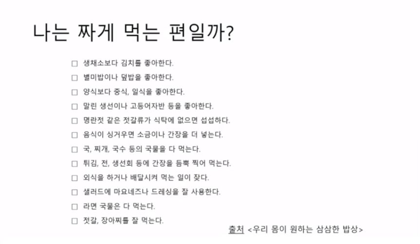 자기는 안 짜게 먹는다는데 실제로는 짜게 먹는 사람들이 있다. 아래 체크리스트에서 5개 이상이면 짜게 먹는 것.