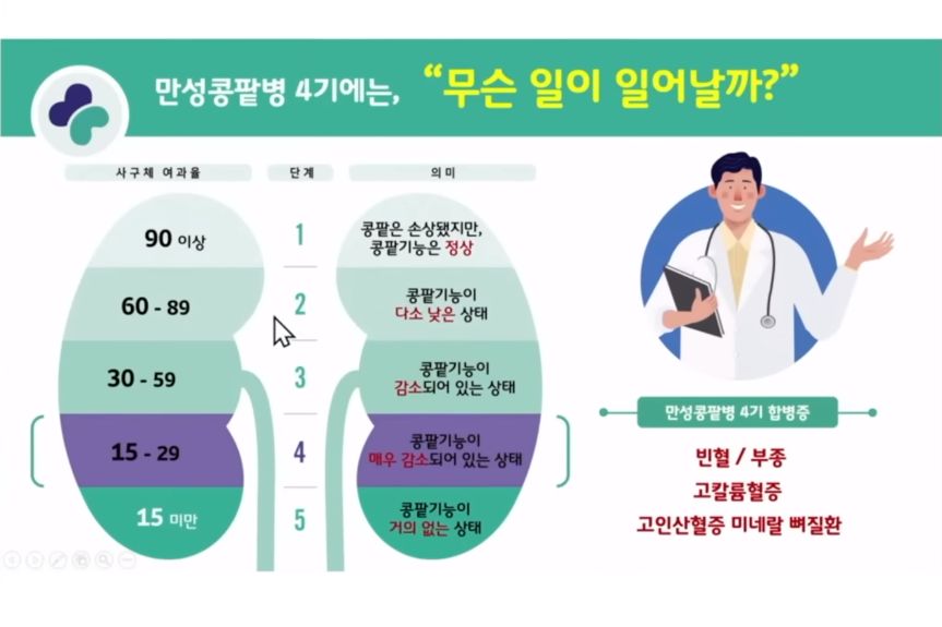 ㅡ 3단계 이상의 콩밭병은 다른 병으로 CT찍을 때 조영제가 신장기능에 부작용을 줄 가능성이 높아진다. 담당의사에게 환자의 신장병력을 알려 확인하게 하면, 의사가 참고하게 된다. 적절한 대안을 찾거나, 신장내과에 의뢰해 환자가 상담하게 한다.
