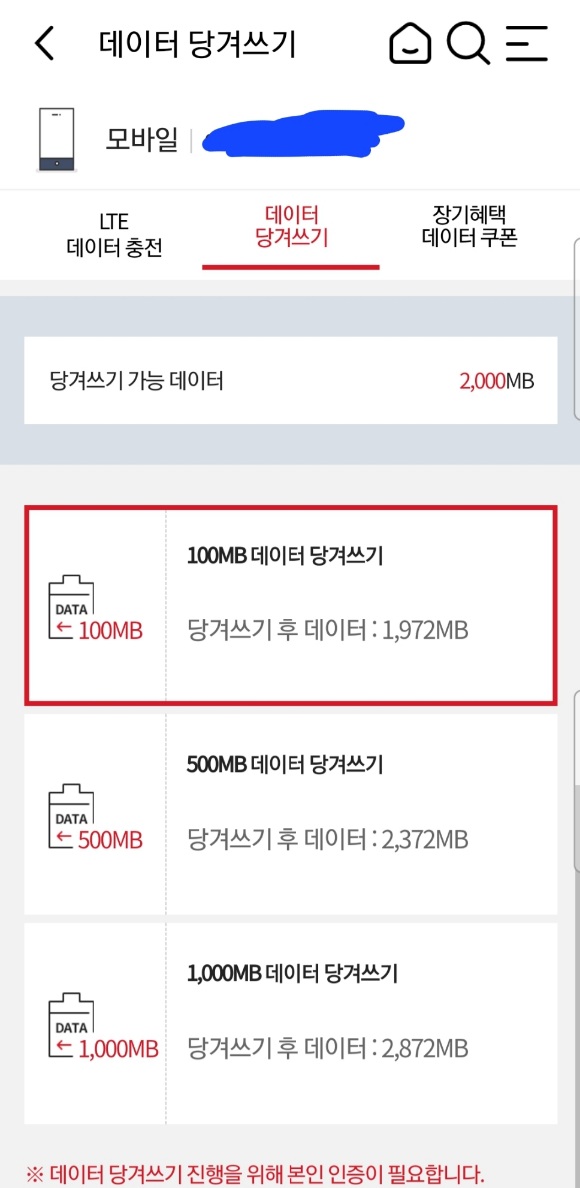 데이터 당겨쓰기는 쿠폰이나 포인트차감과 달리 본인인증 필요.