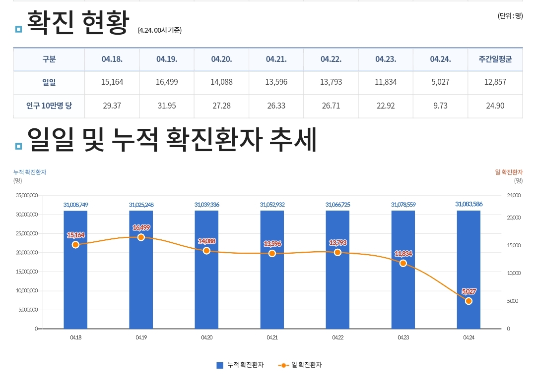 코로나19집계(2023.4.24. 0시기준) 확진 +5천, 사망 +8명, 중환자병상가동률 44% 본문