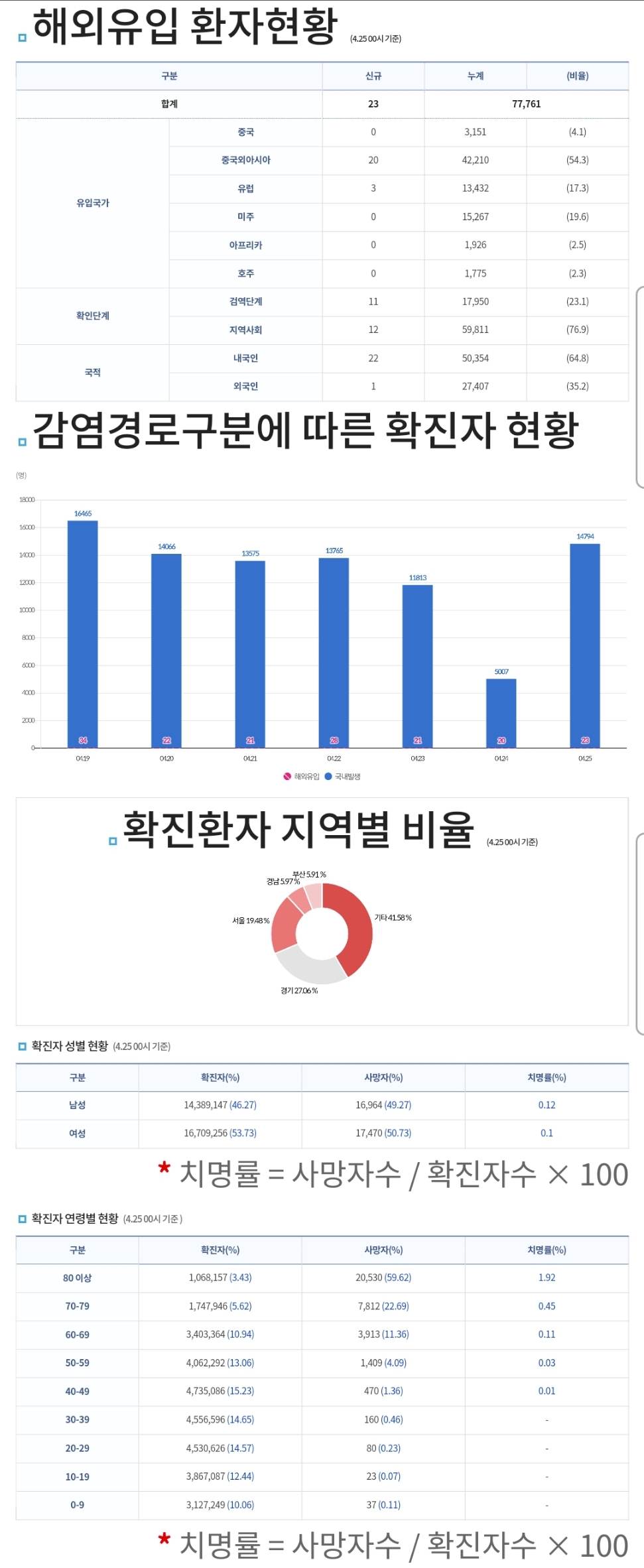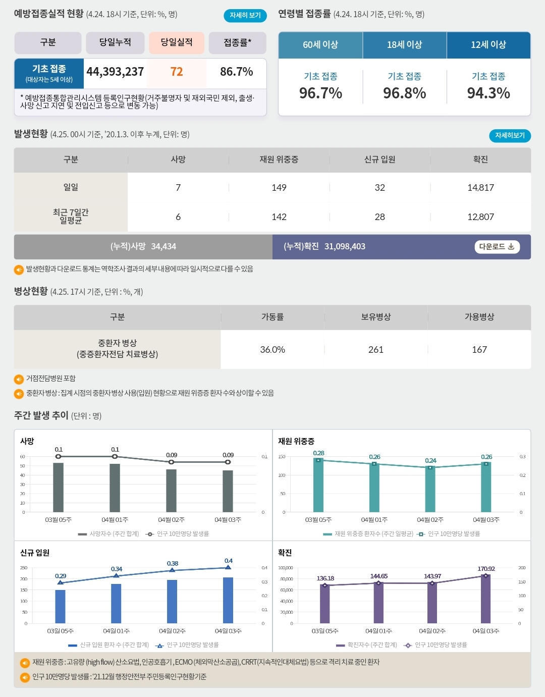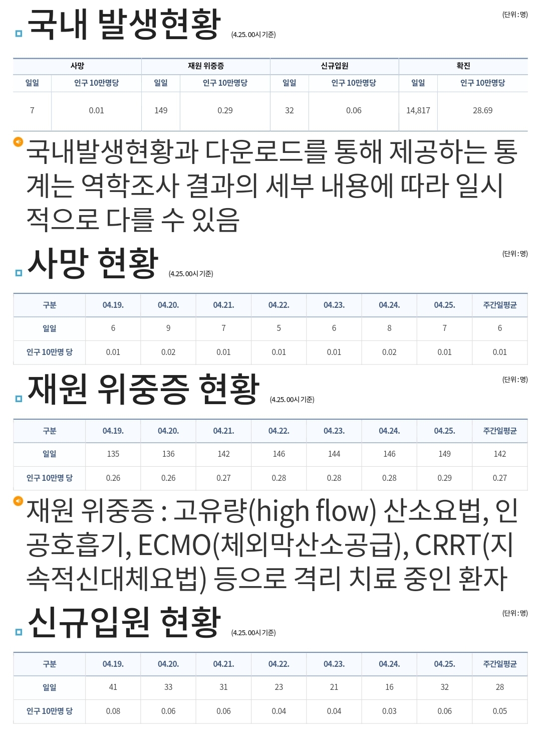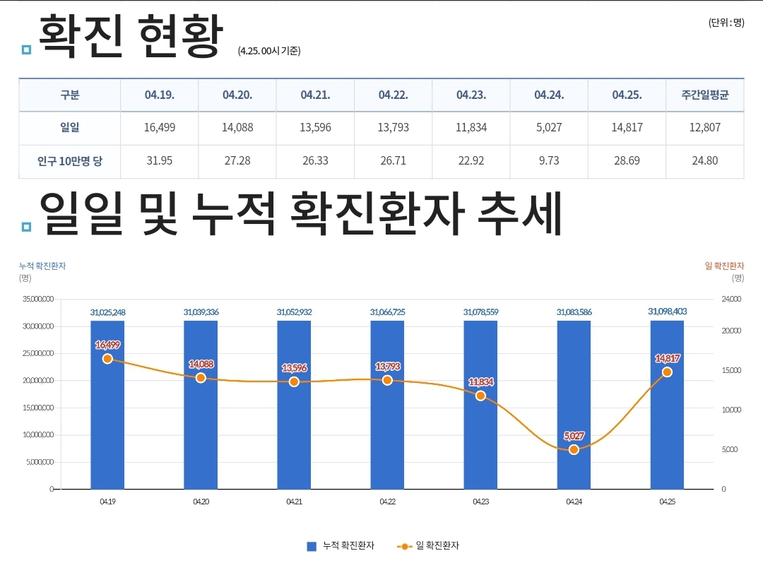 코로나19집계(2023.4.25. 0시기준) 확진 +1.5만, 사망 +7명, 중환자병상가동률 36% 본문