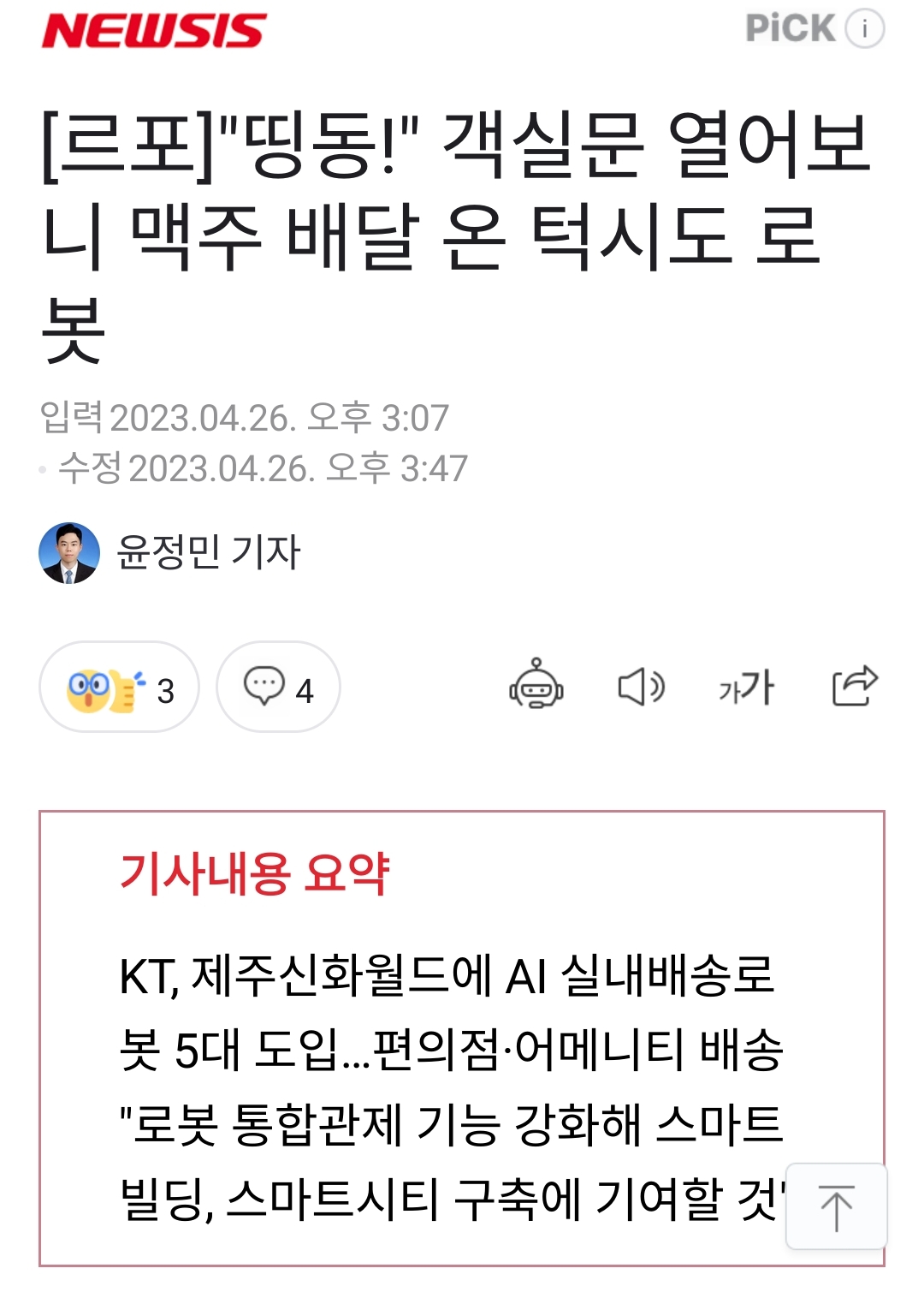 기사내용 요약 KT, 제주신화월드에 AI 실내배송로봇 5대 도입…편의점·어메니티 배송 "로봇 통합관제 기능 강화해 스마트빌딩, 스마트시티 구축에 기여할 것" [제주=뉴시스]윤정민 기자 = "객실에