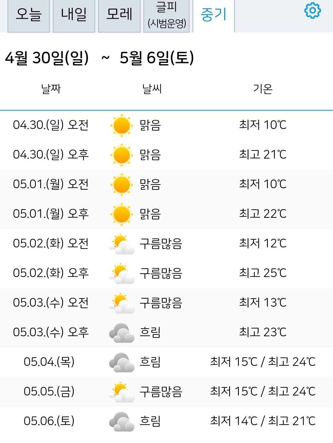 | 2023.4.24.월.~5.3.수. 서울·대전 일기예보 (0) | 2023.04.23 |