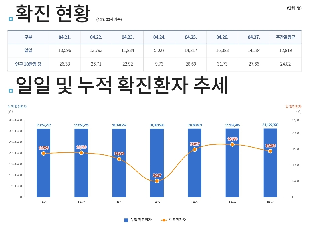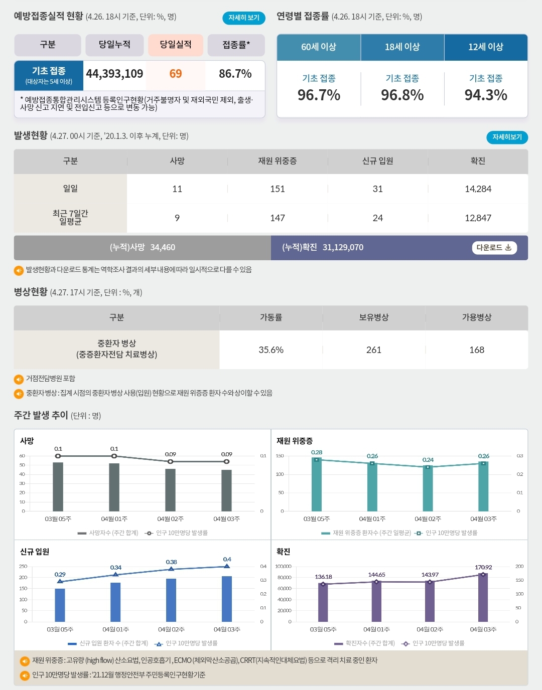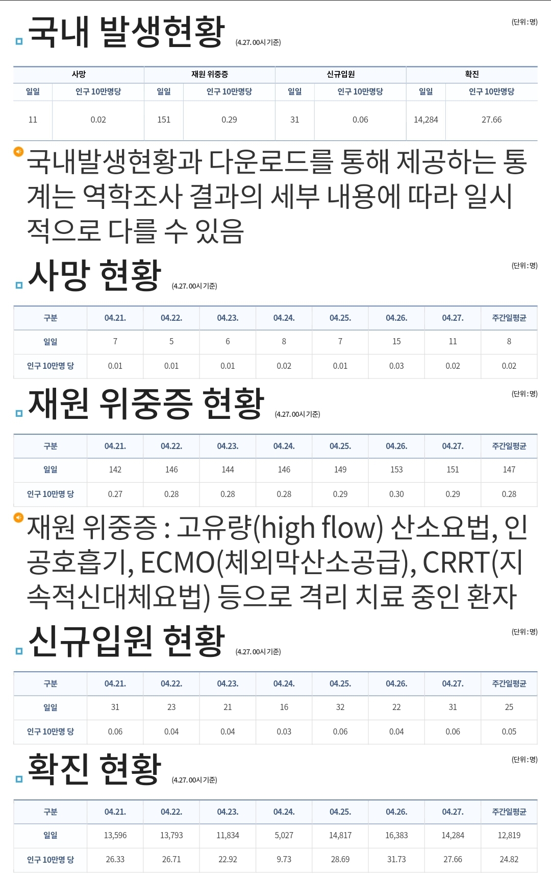 코로나19집계(2023.4.27. 0시기준) 확진 +1.4만, 사망 +11명, 중환자병상가동률 36% 본문