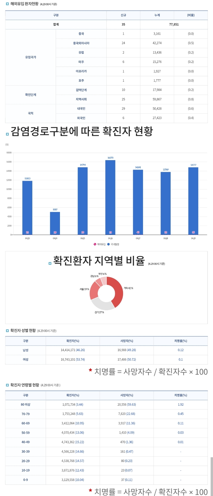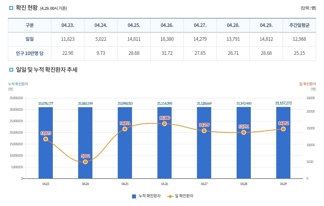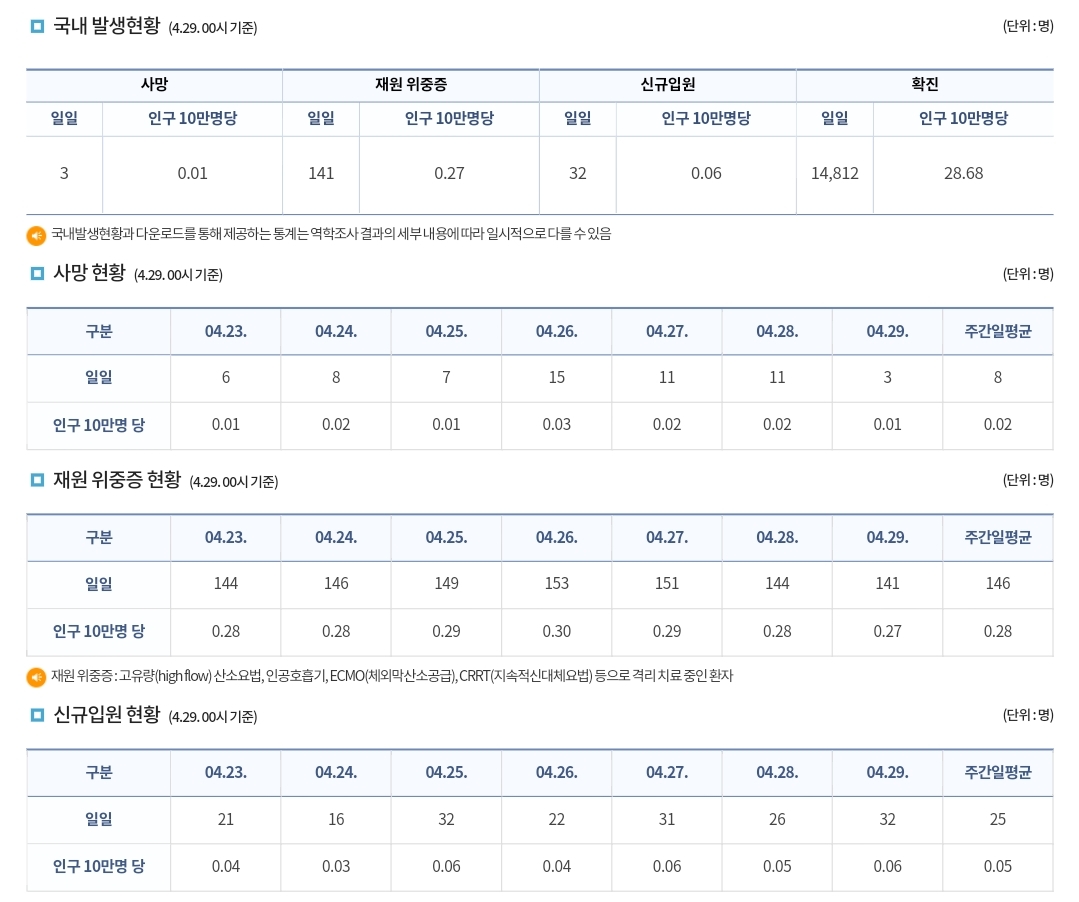 코로나19집계(2023.4.29. 0시기준) 확진 +1.5만, 사망 +3명, 중환자병상가동률 35% 본문