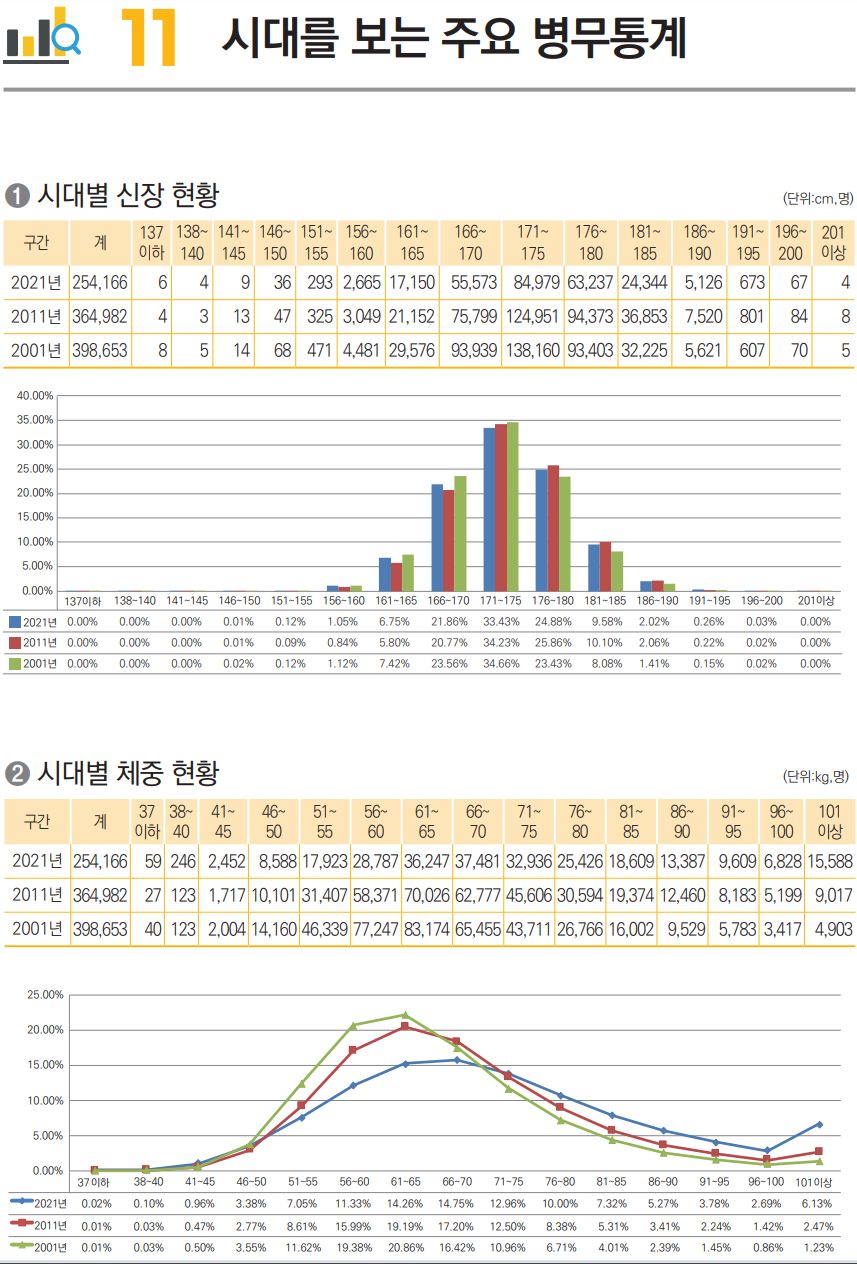 2001년, 2011년, 2021년 병역대상자 신장분포현황과 체중분포현황.