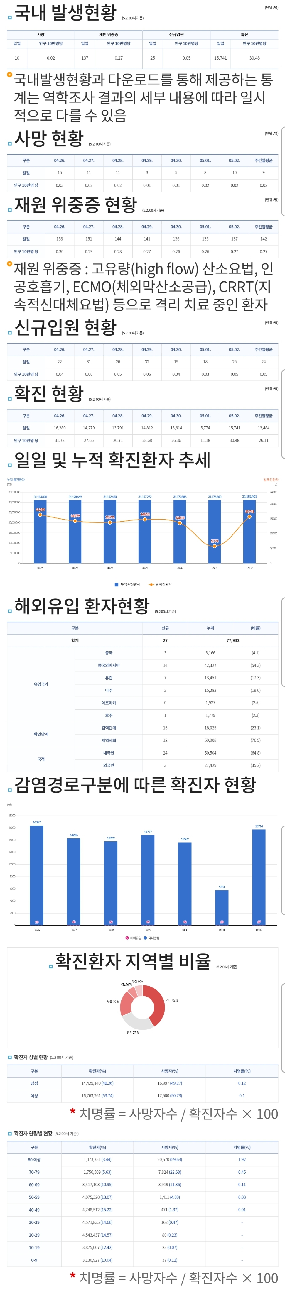코로나19집계(2023.5.2. 0시기준) 확진 +1.6만, 사망 +10명, 중환자병상가동률 41% 본문