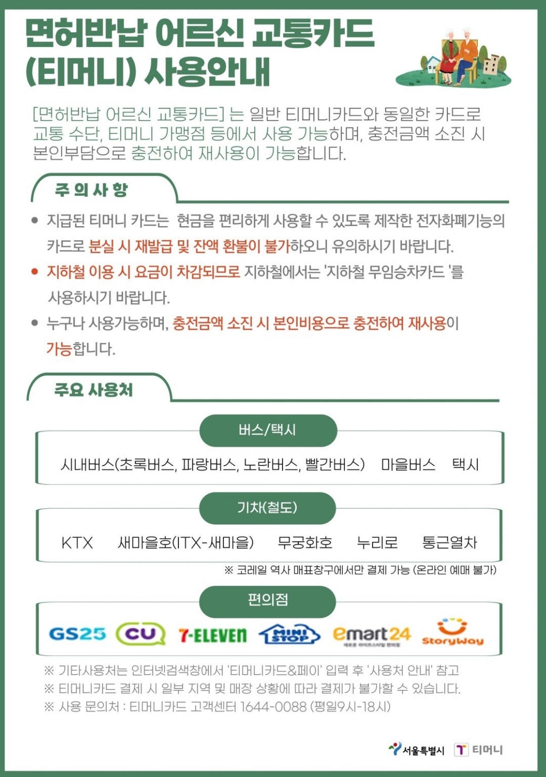 ♣ 면허반납 어르신 교통카드는 버스, 택시, 기차 등 교통수단과 편의점 등 티머니 가맹점에서도 사용하실 수 있습니다. (지하철 이용시 요금 차감됩니다.)