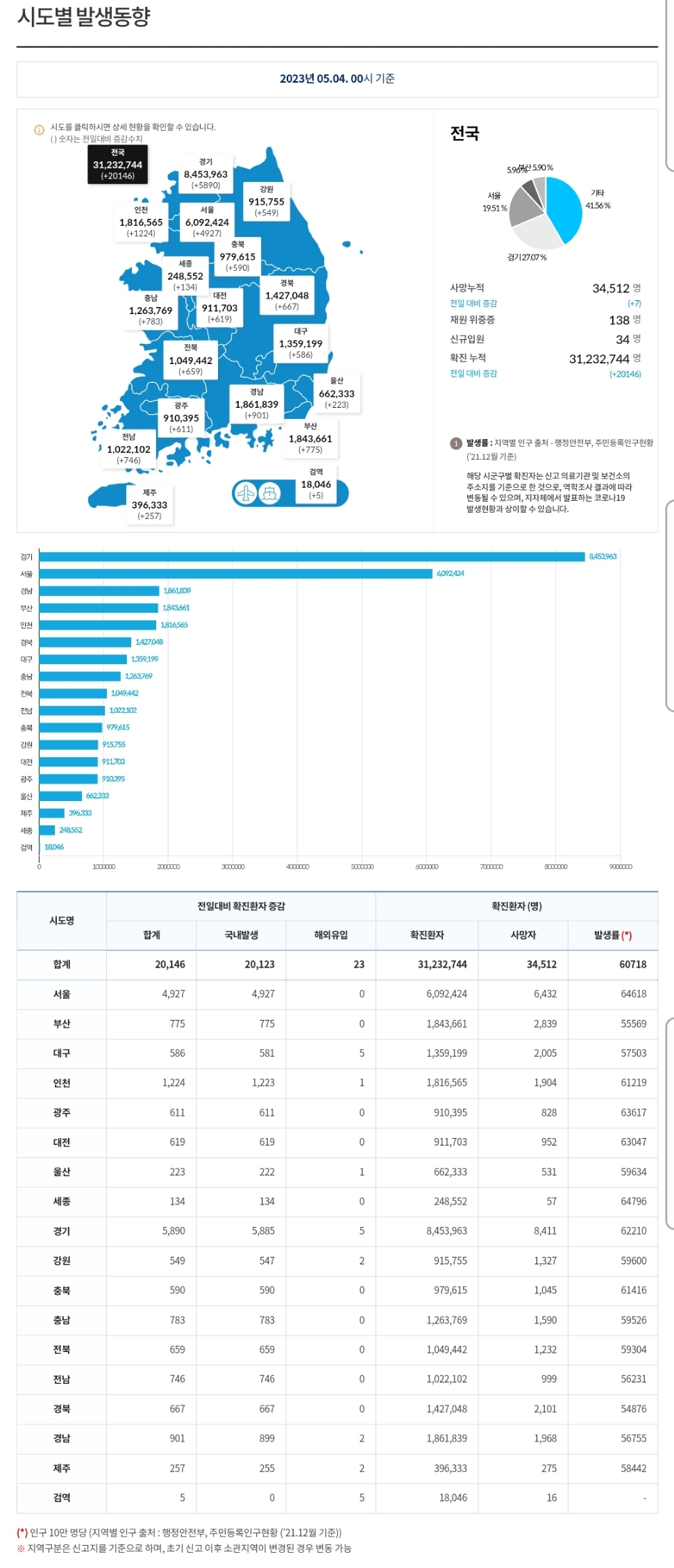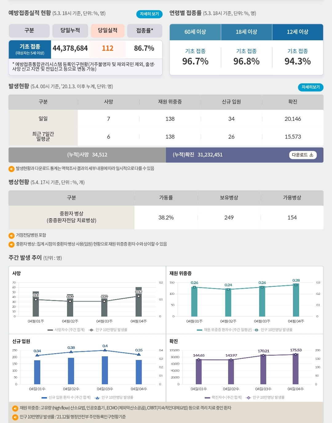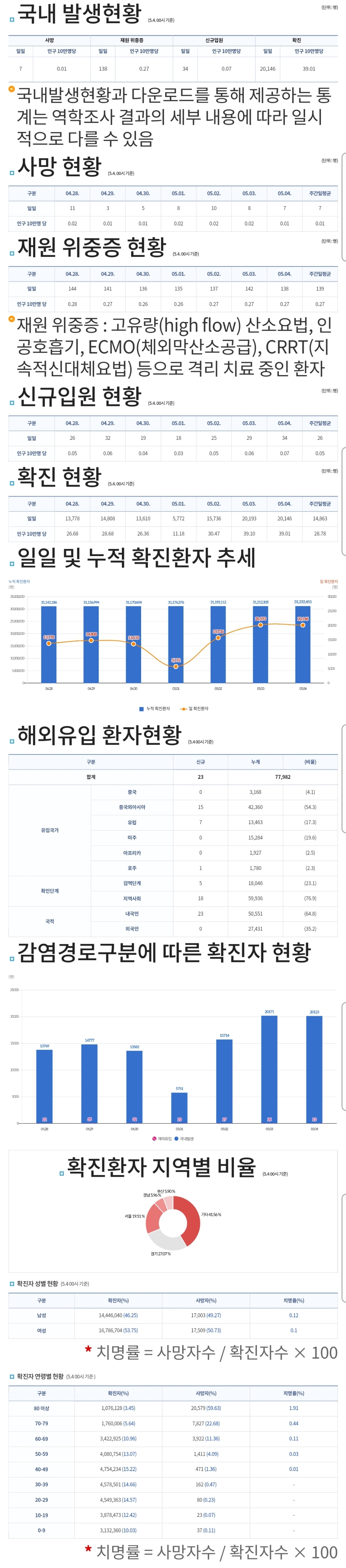 코로나19집계(2023.5.4. 0시기준) 확진 +2만, 사망 +7명, 중환자병상가동률 38% 본문