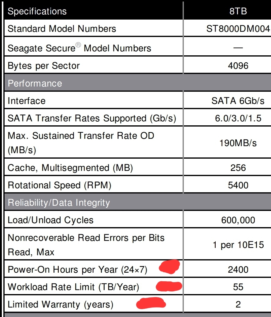 Seagate Baracuda HDD spec. sheethttps://www.seagate.com/www-content/datasheets/pdfs/3-5-barracudaDS1900-11-1806US-en_US.pdf 모델명: ST8000DM004 ST6000DM003 ST4000DM004 ST3000DM007 ST2000DM005 ST2000DM008 ST2000DM006 ST1000DM010 ST500DM009 Seagate Itonwo