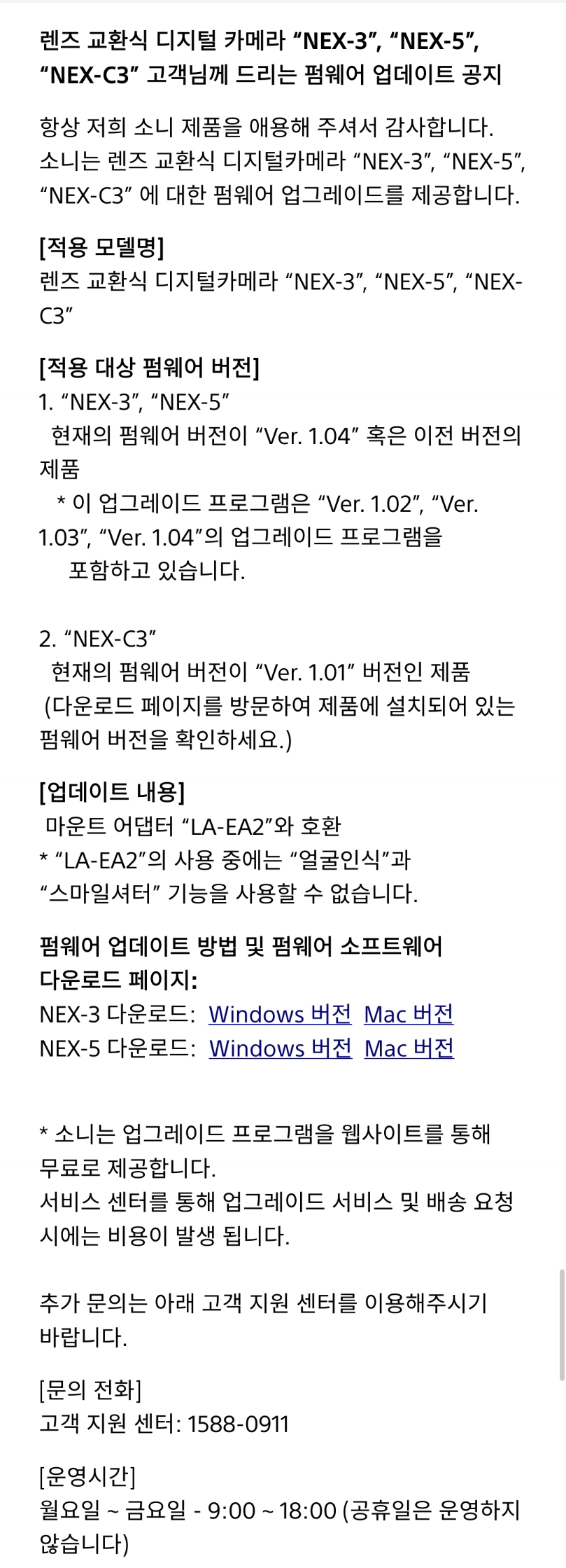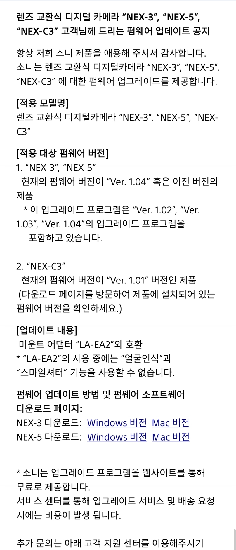소니 고객센터의 펌웨어 관련 링크. NEX-3, NEX-5, NEX-C3의 마지막 펌웨어