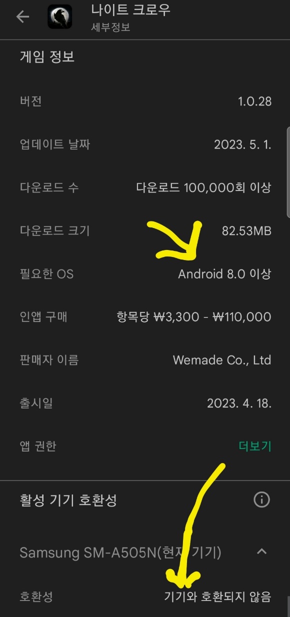 언드로이드11 스마트폰에서 호환되지 않는다는, 위메이○의 모 게임 본문