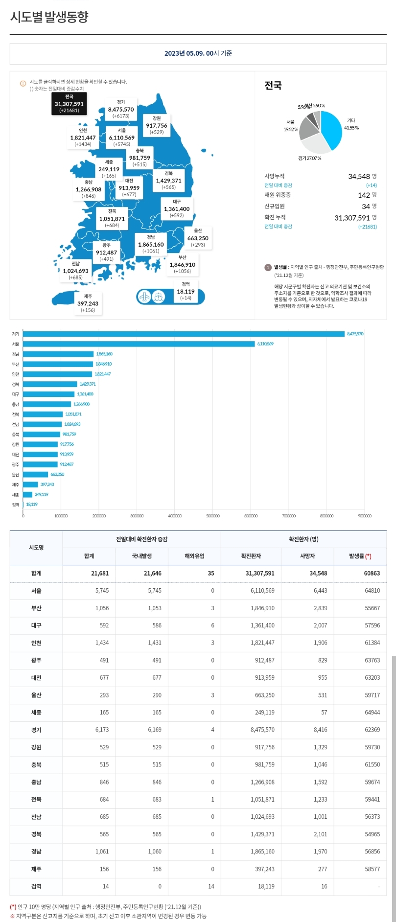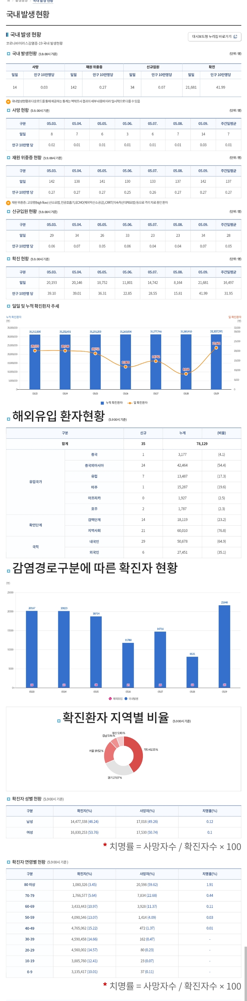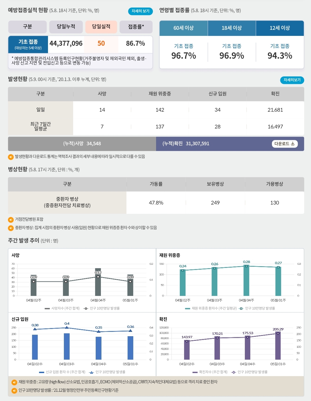 코로나19집계(2023.5.9. 0시기준) 확진 +2.2만, 사망 +14명, 중환자병상가동률 48% 본문