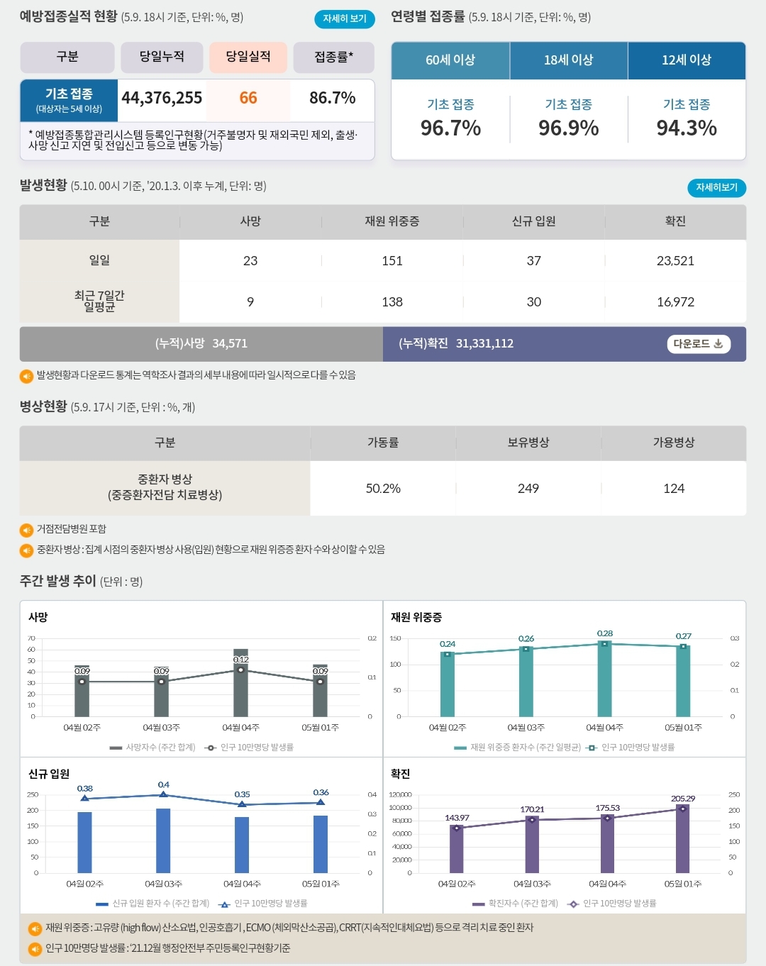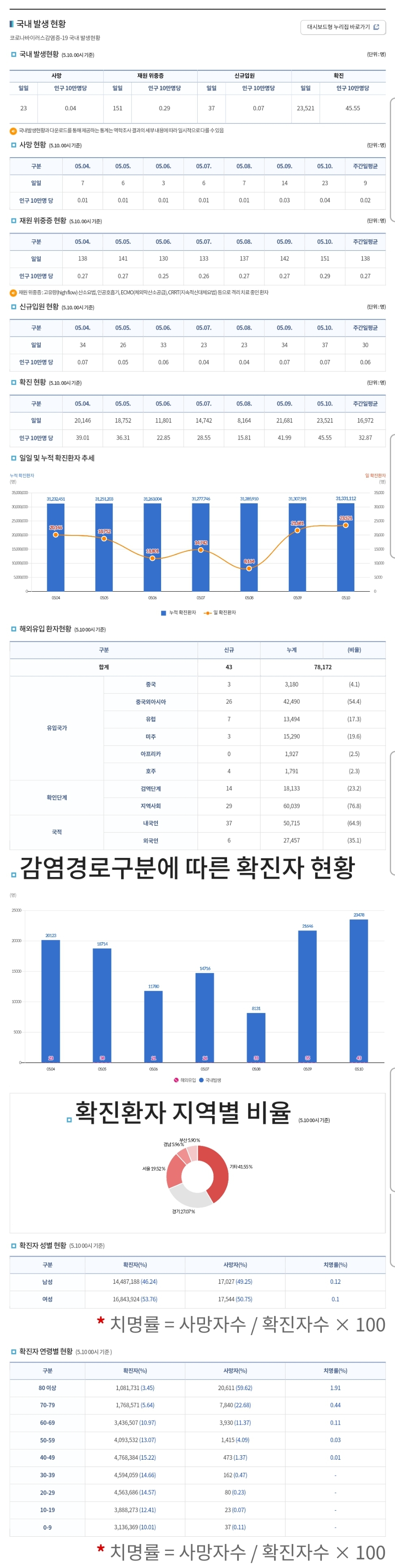 코로나19집계(2023.5.10. 0시기준) 확진 +2.4만, 사망 +23명, 중환자병상가동률 50% 본문