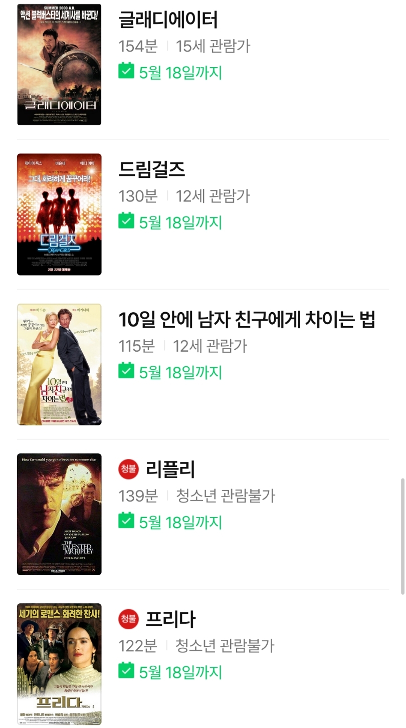 ~5.18까지.. 글래디에이터, 드림걸즈, 10일 안에 남자친구에게 차이는 법, 리플리, 프리다, 더티 프리티 씽