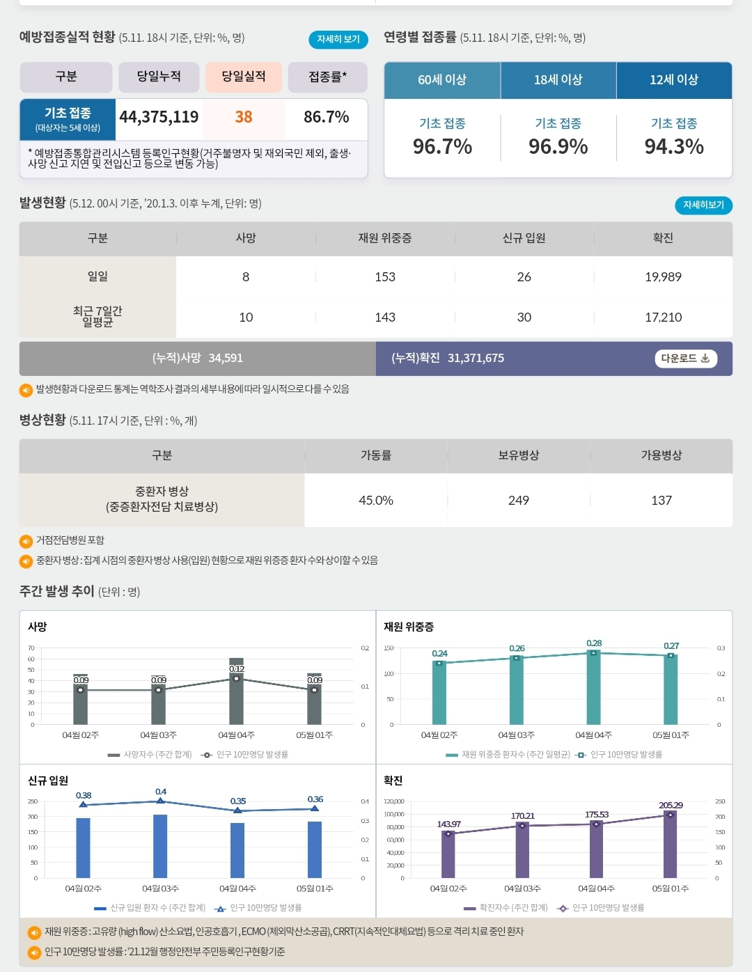 코로나19집계(2023.5.12. 0시기준): 확진 +2만, 사망 +8명, 중환자실가동률 45% 본문