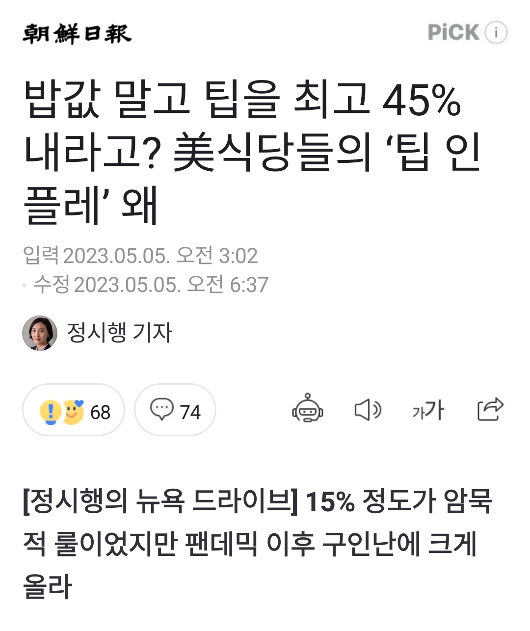 15% 정도가 암묵적 룰이었지만 팬데믹 이후 구인난에 크게 올라 미국에서 물가가 고공 행진을 계속하는 가운데 ‘팁(tip·봉사료) 인플레이션’이란 말이 등장했다. 최근 치솟은 팁마저 가계 지출