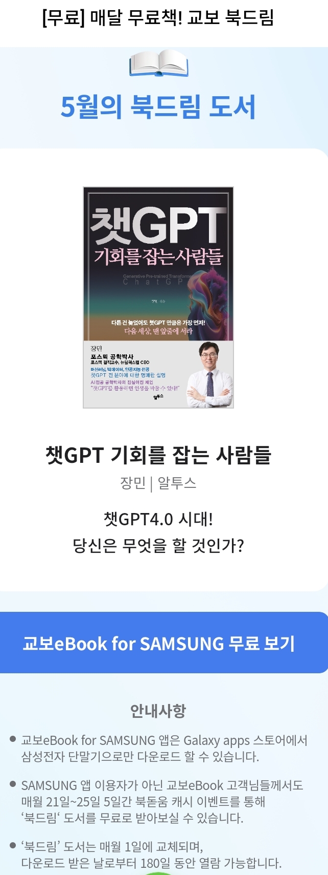 교보문고가입해 교보ebook for samsung 앱을 이용하면 매달 선정된 책을 볼 수 있습니다.
