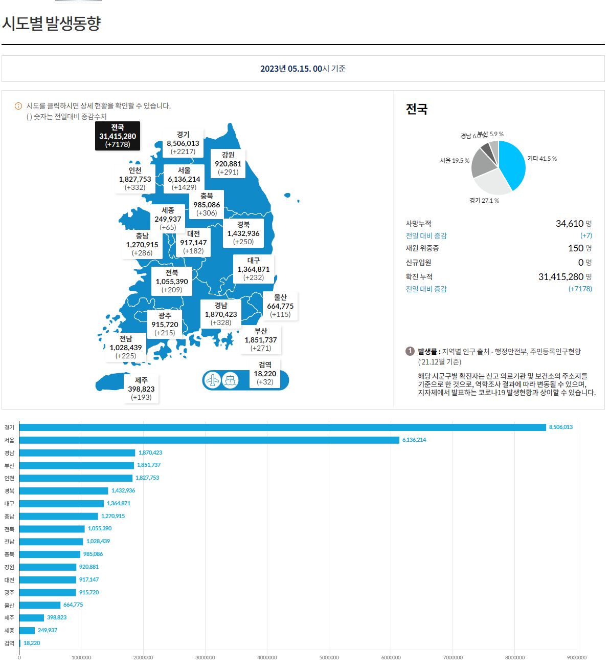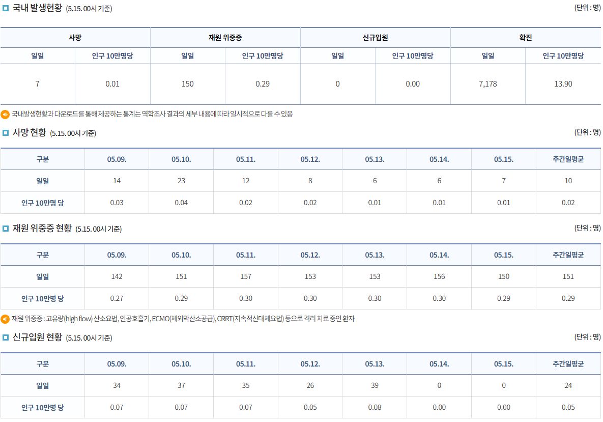 코로나19집계(2023.5.15. 0시기준) 확진 +7천, 사망 +7명, 중환자병상가동률 47%/:/ 코로나19 대시보드 사이트 개선희망 본문