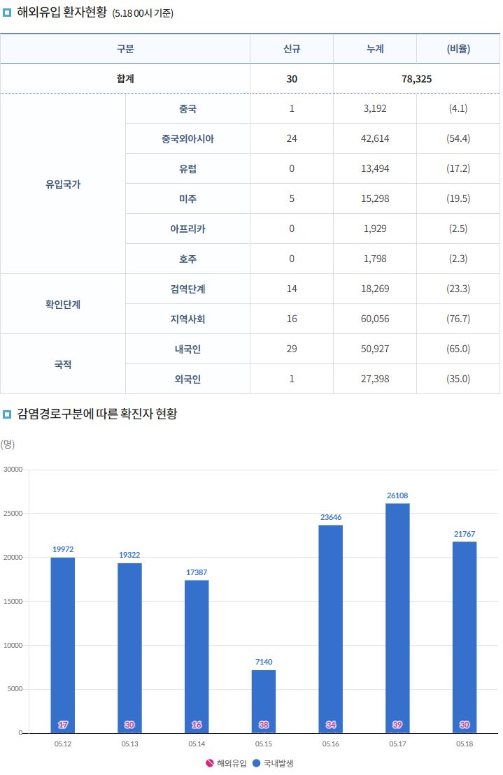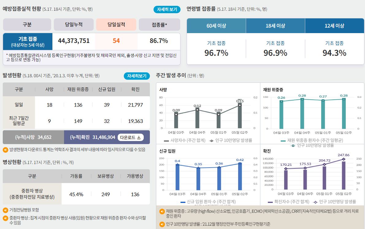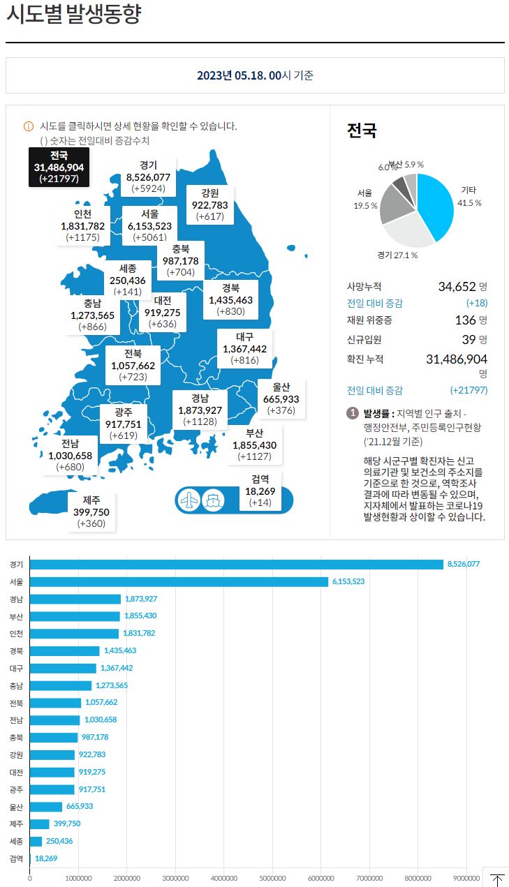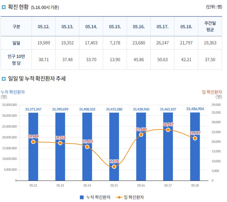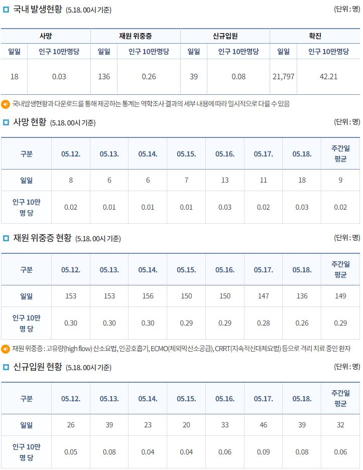 코로나19집계(2023.5.18. 0시기준) 확진 +2.2만, 사망 +18명, 중환자병상가동률 45% 본문