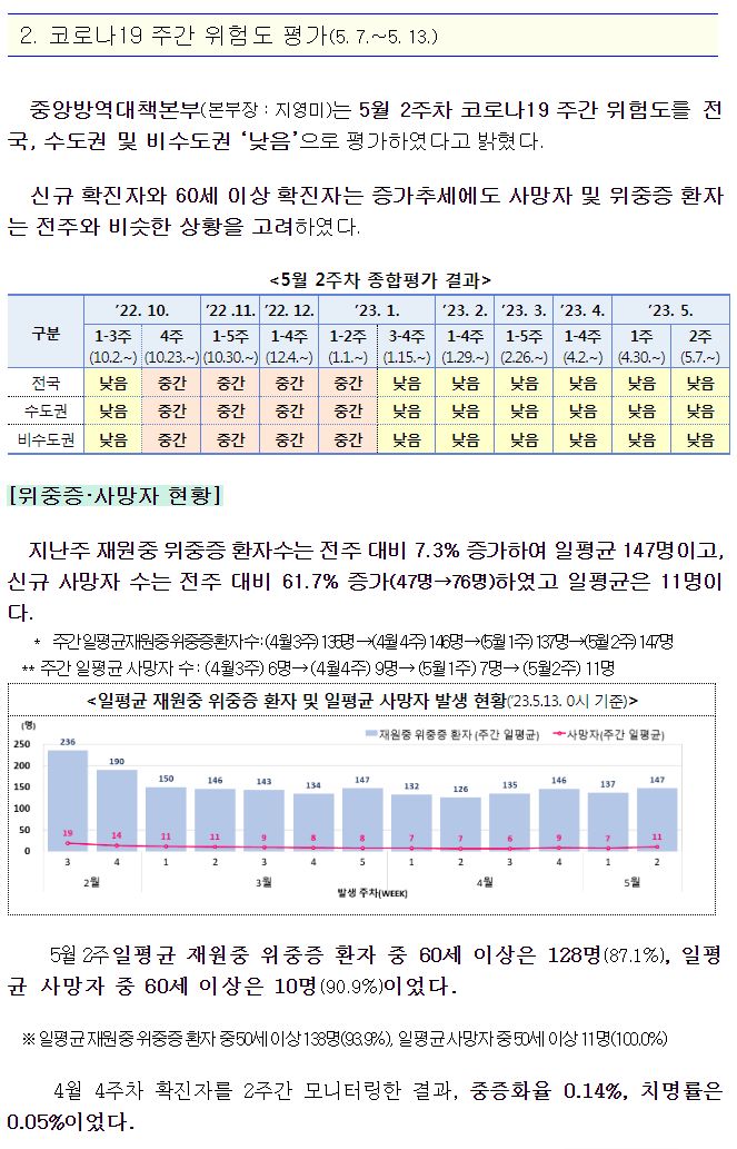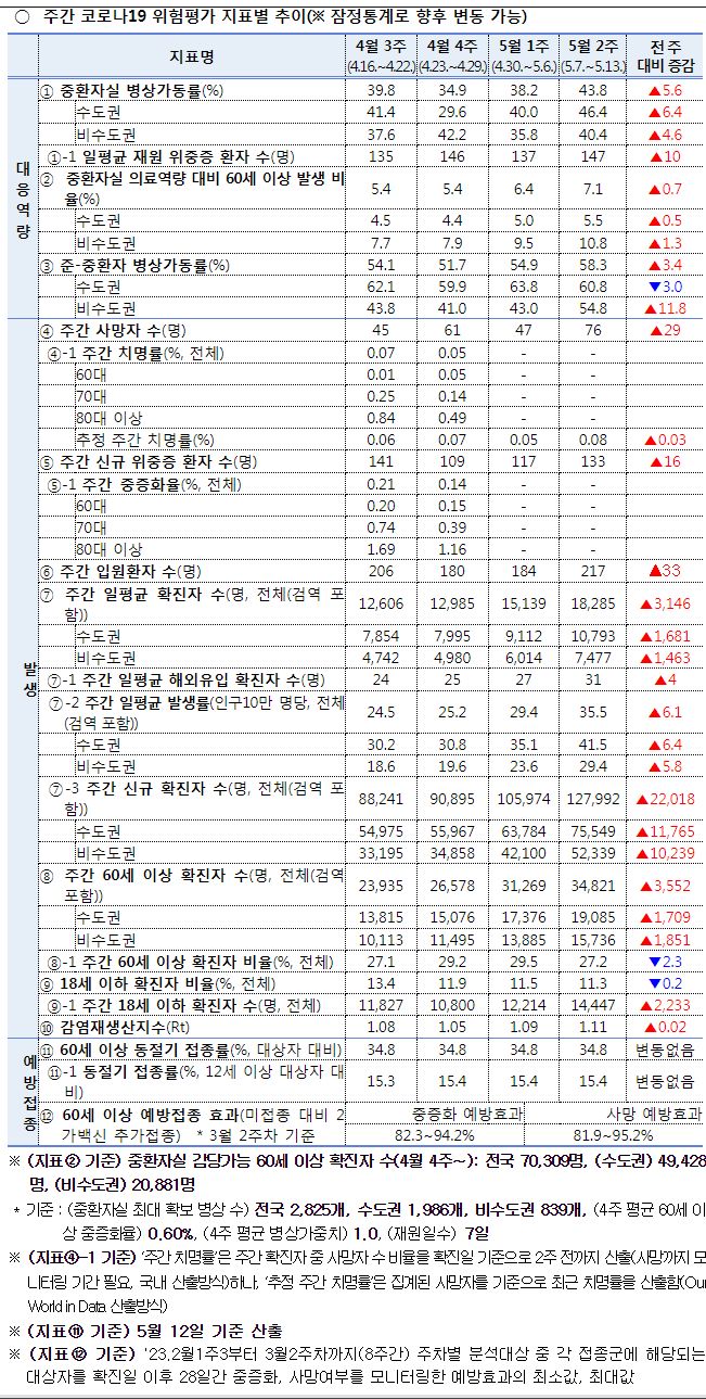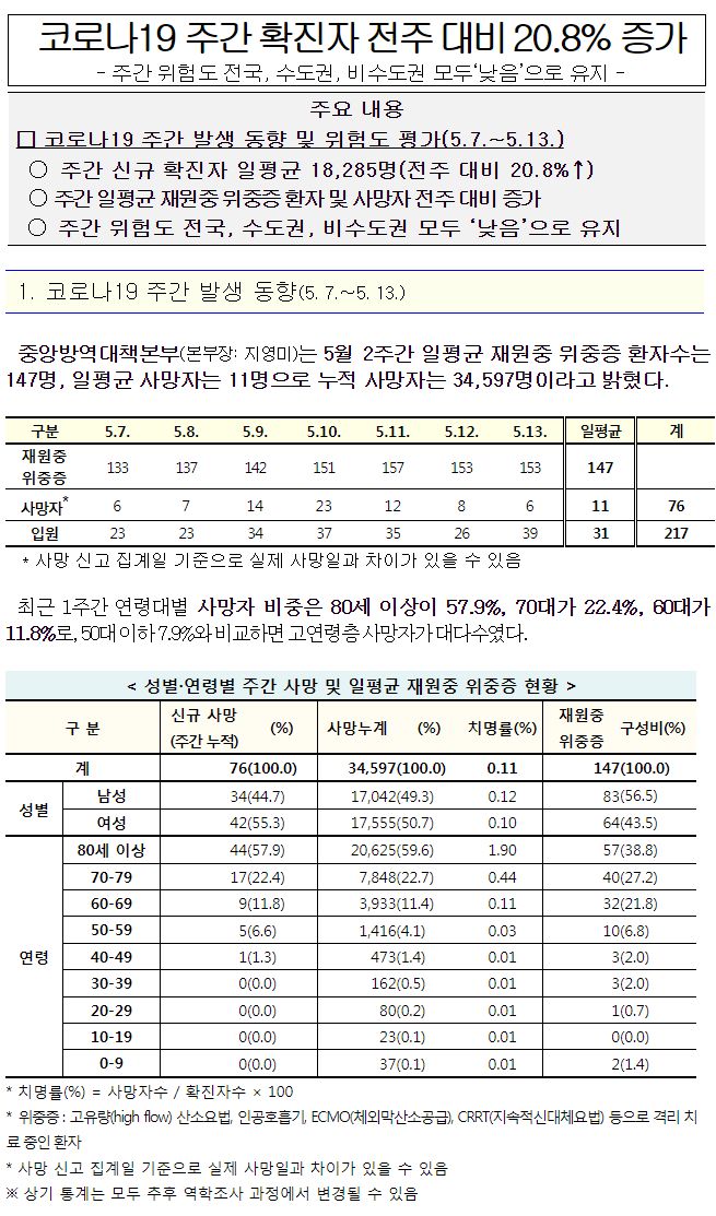 □ 코로나19 주간 발생 동향 및 위험도 평가(5.7.~5.13.)