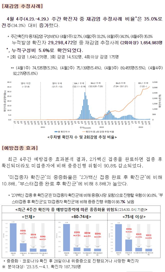 BA.4/5 변이주대응 백신을 맞지 않은 사람들 대부분이 면역이 떨어졌거나 떨어져갈 때인데 요즘은 백신을 맞는 사람이 확 줄었고(아래 보도자료의 주간 신규 2가백신 접종자 집계부분), 세계보건기구의 발표에 따라 출입국 및 국내 보건정책이 완화된 것도 있을 것입니다.