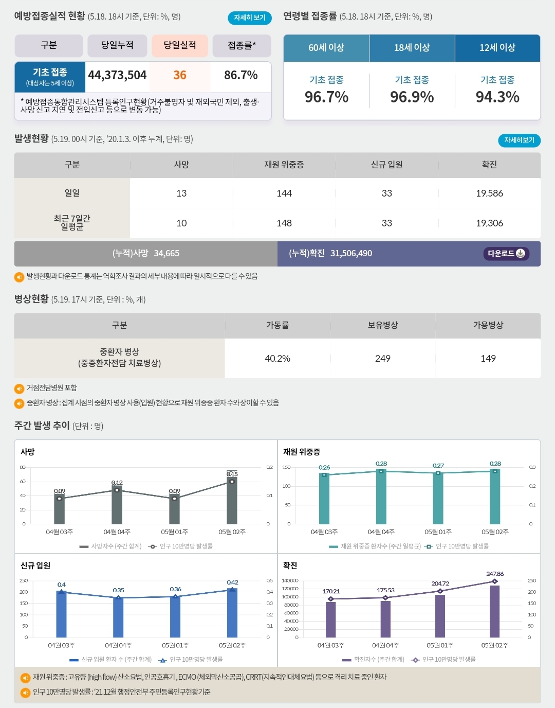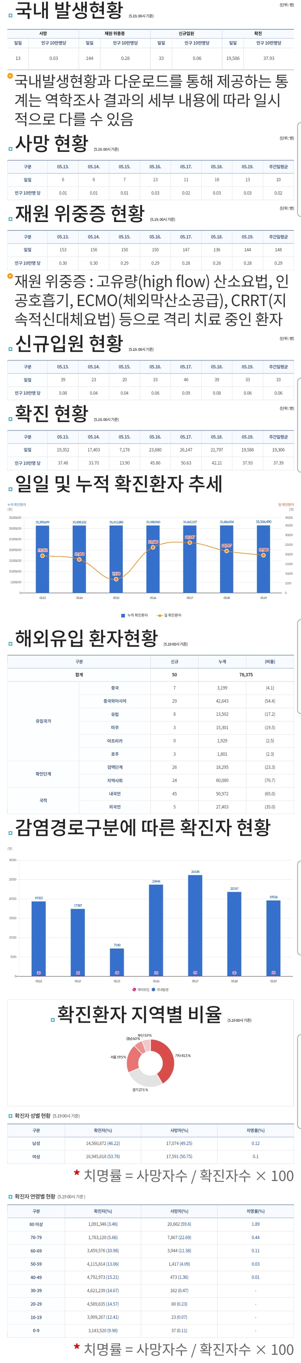 코로나19집계(2023.5.19. 0시기준) 확진 +2.0만, 사망 +13명, 중환자병상가동률 40% 본문