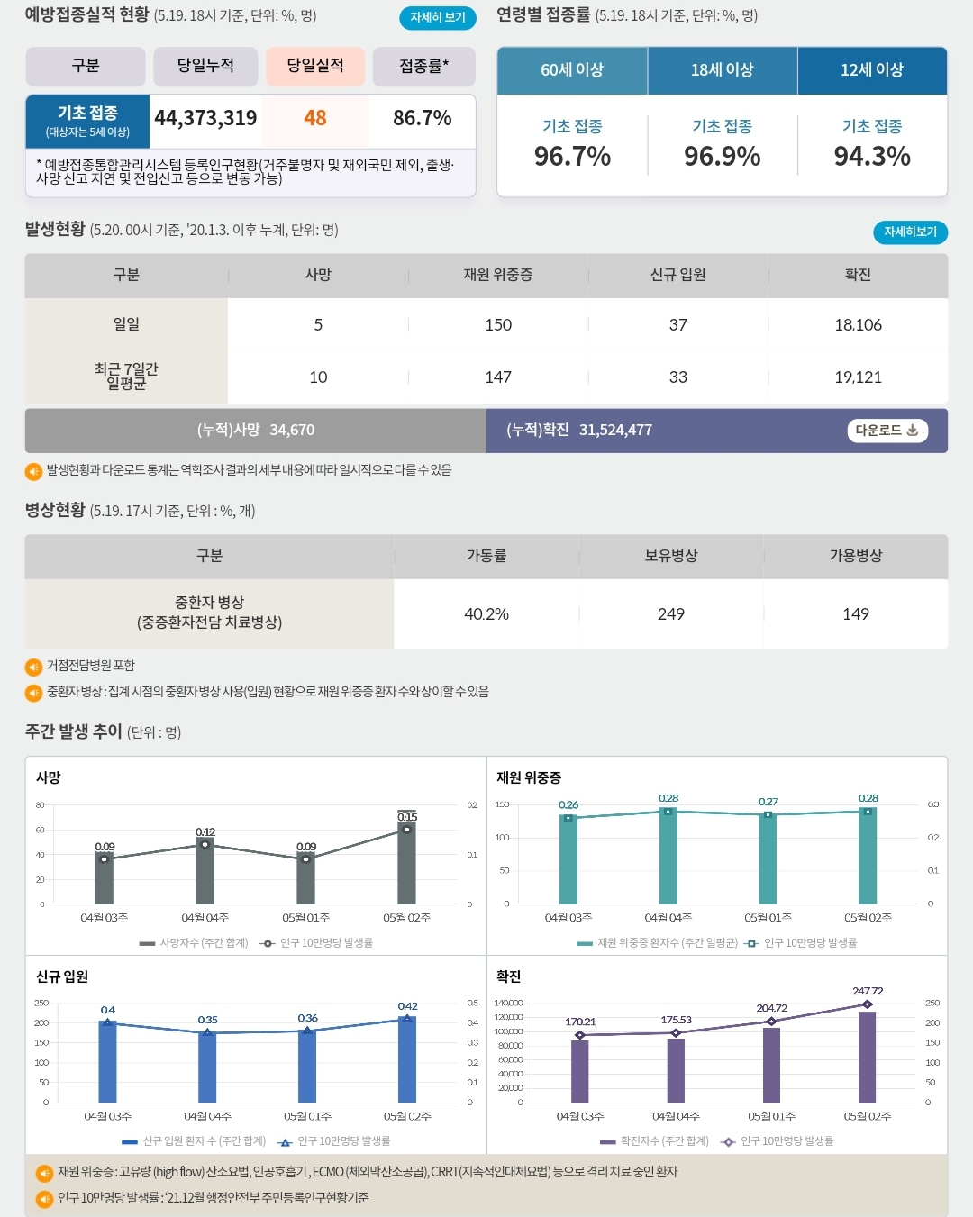 코로나19집계(2023.5.20. 0시기준) 확진 +1.8만, 사망 +5명, 중환자병상가동률 40% 본문