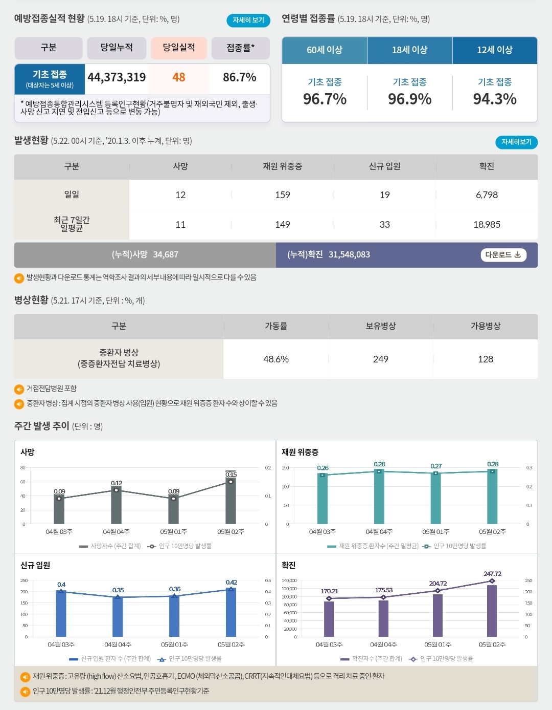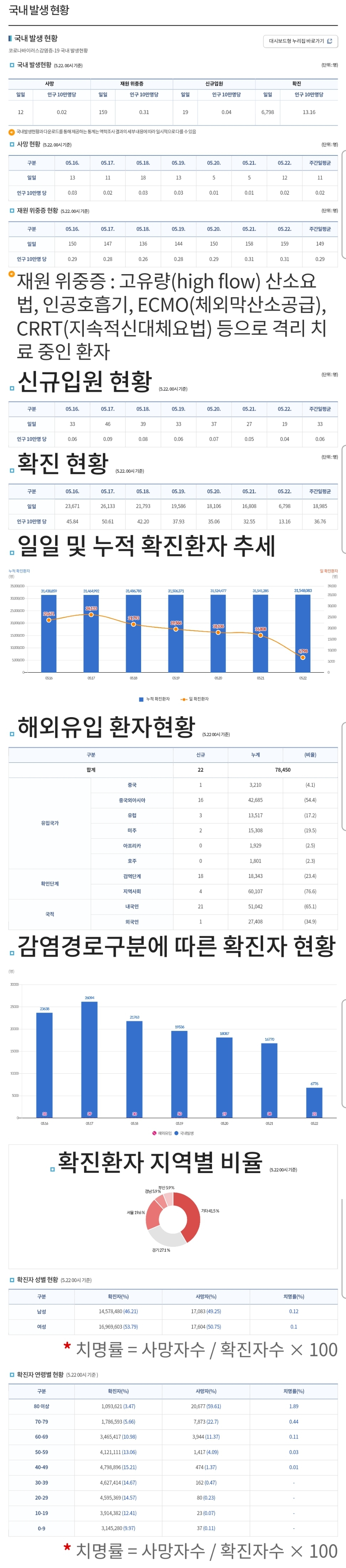 코로나19집계(2023.5.22. 0시기준) 확진 +7천, 사망 +12명, 중환자병상가동률 49% 본문